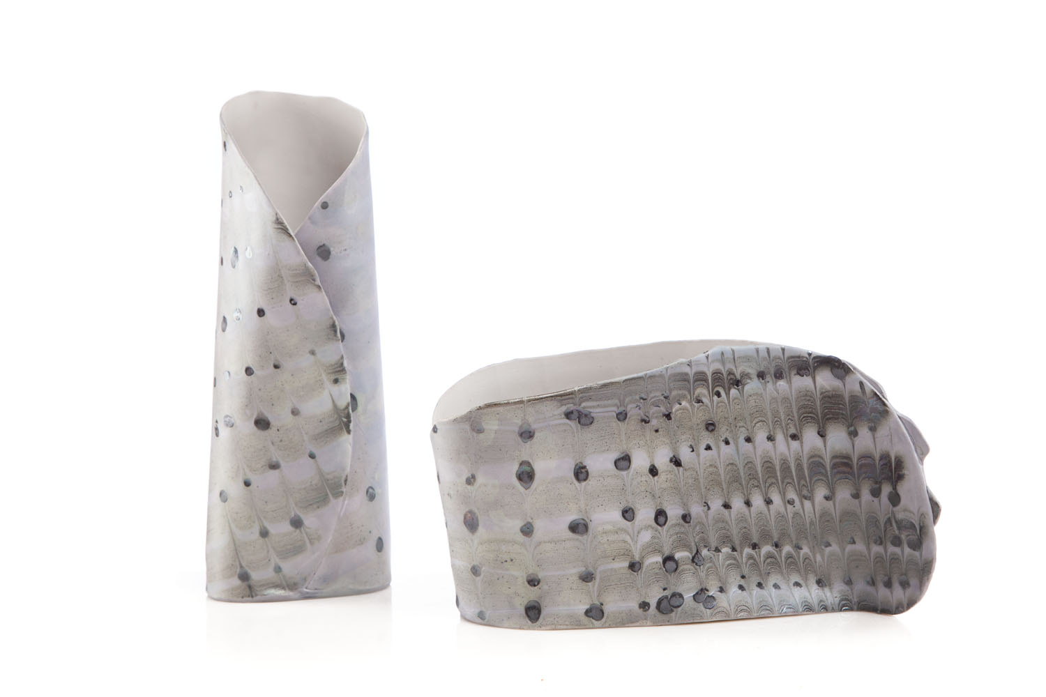 ceramika autorska; mniejsza: wys. 14 cm, szer. 9,5 cm, głęb. 24 cm, wyższa forma: wys. 26 cm, szer. 9,5 cm, głęb. 6,5 cm.