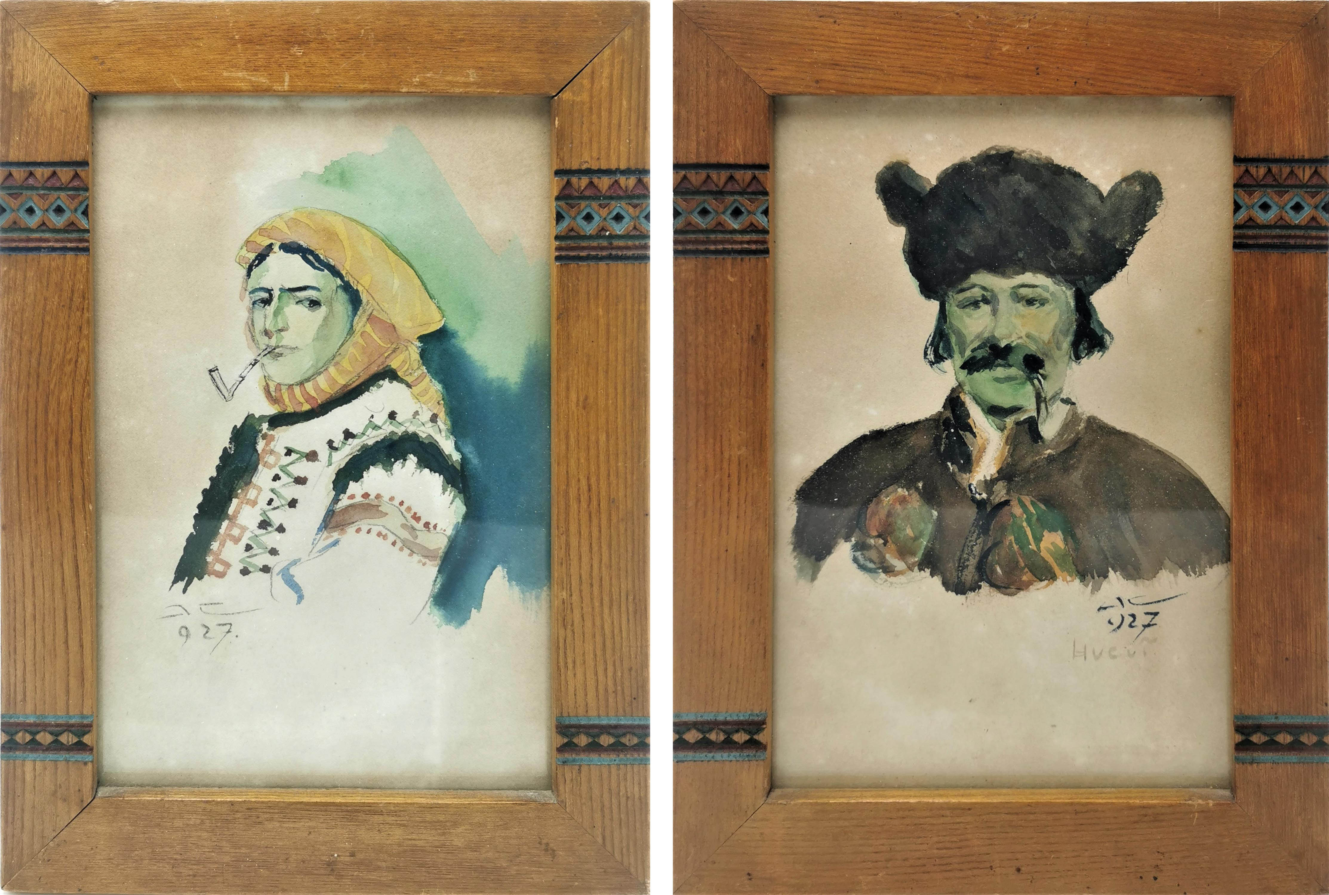 - Hucuł, 1927: akwarela, papier; 23 x 15 cm (w świetle ramki); sygn., dat. i opisany p. d.: A C / 927 / Hucuł;