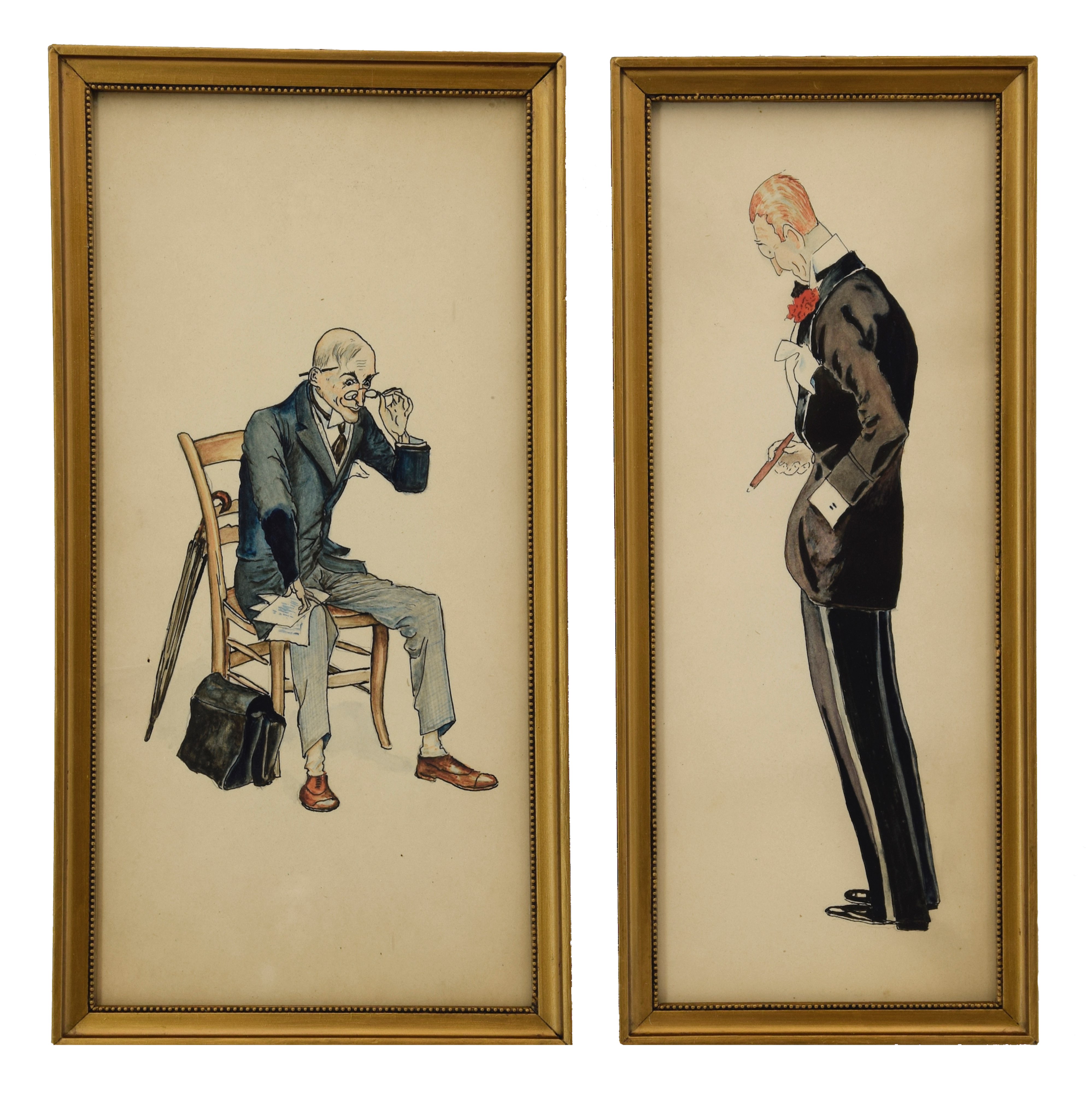1. Mężczyzna z cygaremołówek, tusz, akwarela, papier; 27,5 x 10,3 cm;2. Mężczyzna siedzący na krześleołówek, tusz, akwarela, papier; 27,5 x 13 cm.