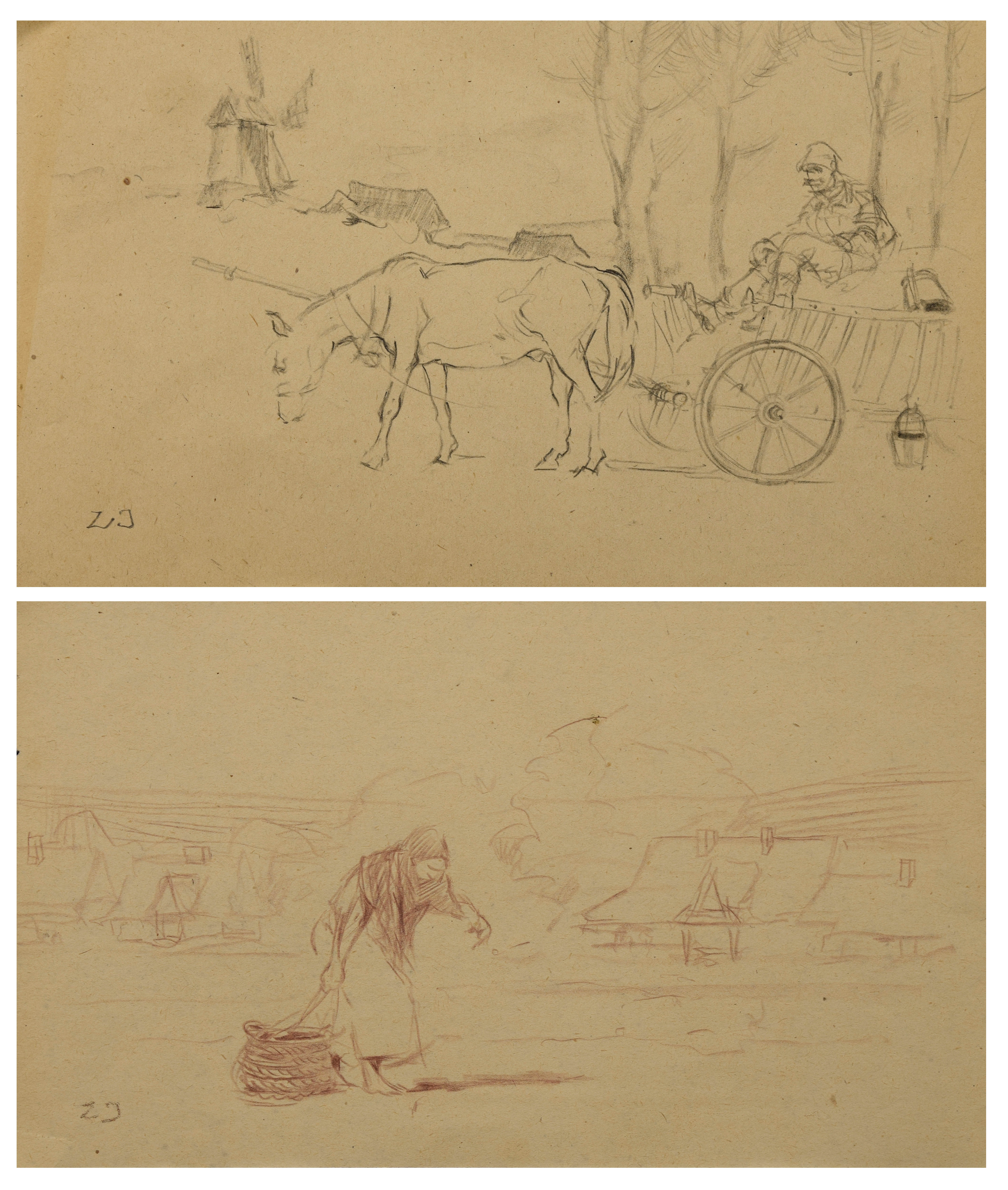 1. Kobieta w polusangwina, papier; 15,5 x 26,5 cm; sygn. l. d.: ZJ;2. Postójołówek, papier; 16 x 26,7 cm; sygn. l. d.: ZJ.