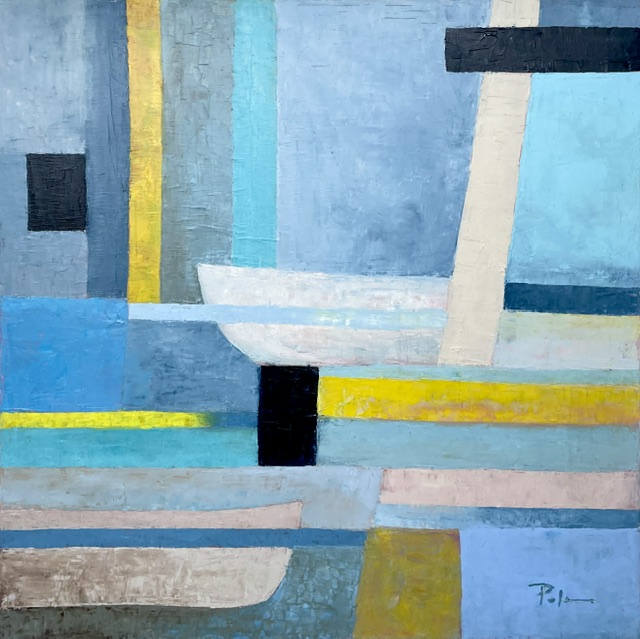 olej/płótno, 75 x 75 cmoprawiony w ramę 3 x 3 cm, opis, sygnatura, datowanie na odwrociu: ,,Pastelowy poranek / Pastel morning", 2024, Paulina Leszczyńska - Pola