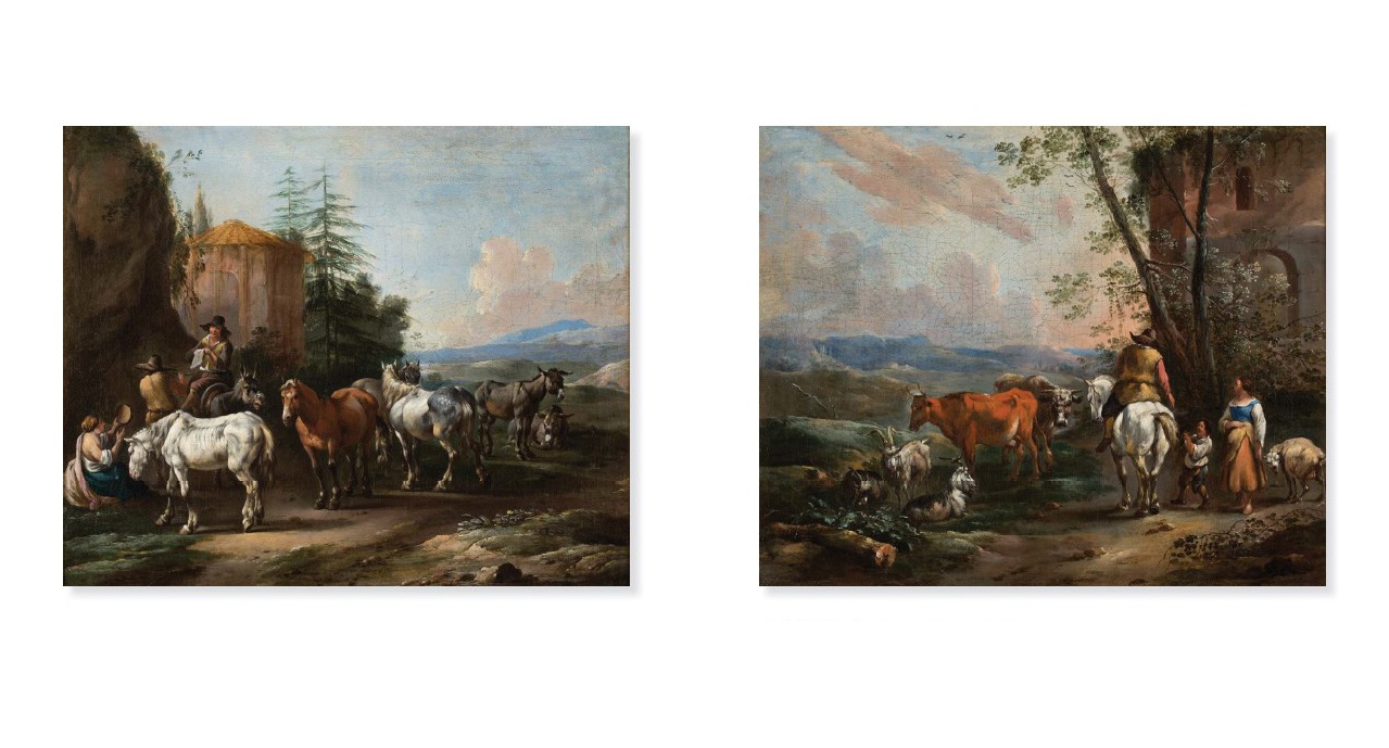 PASTERZE Z KOŃMI PRZED RUINĄ, XVII W.olej, płótno, 47 x 57 cmsygn. ś.d.: S.V. DouwRODZINA PASTERZY Z BYDŁEM PRZED RUINĄ, XVII W.olej, płótno, 47 x 58 cmsygn. ś.d.: S.V. Douw