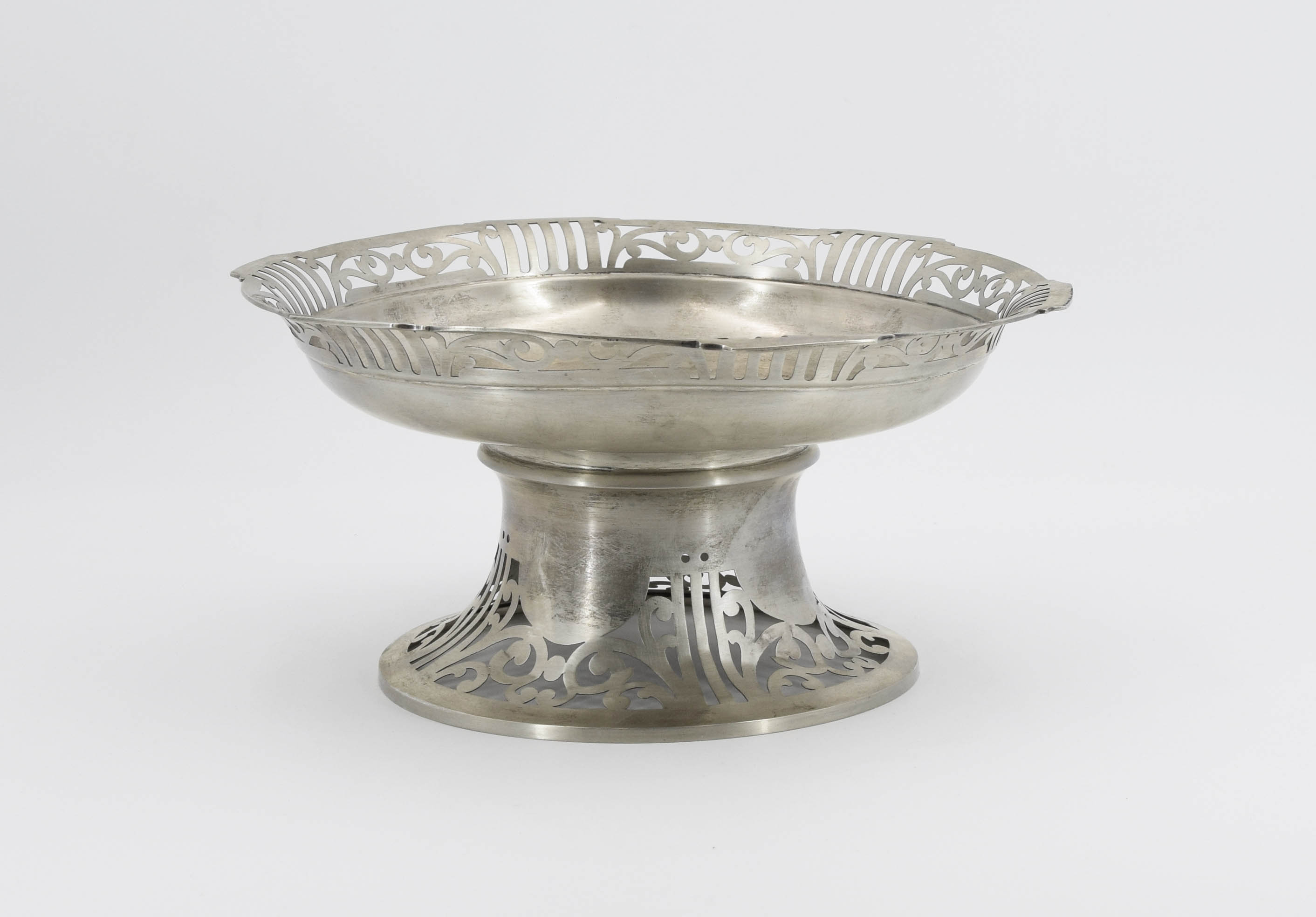 Patera na okrągłej ażurowej stopie, dekorowanej ornamentem roślinno-geometrycznym, przechodzącej w trzon, na którym wspiera się głęboki talerz patery, z gładkim lustrem i wywiniętym, ażurowym kołnierzem dekorowany podobnie jak stopa.