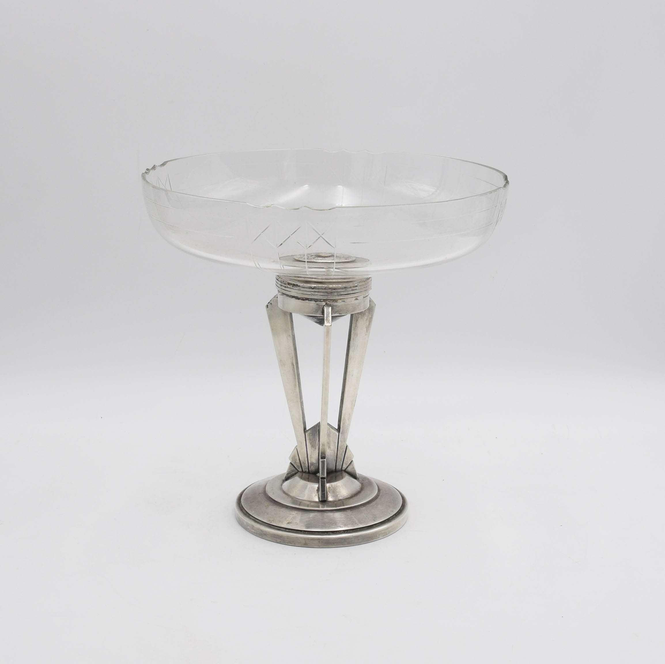 Wsparta na okrągłej, uskokowo wywyższonej stopie, z trzonem uformowanym z trzech rozszerzających się ku górze płaskowników, u dołu ozdobionym geometrycznymi, wachlarzowymi podporami; na trzonie osadzony talerz patery ze szkła dekorowanego grawerowanym wzorem geometrycznym oraz falistymi nacięciami na krawędzi.