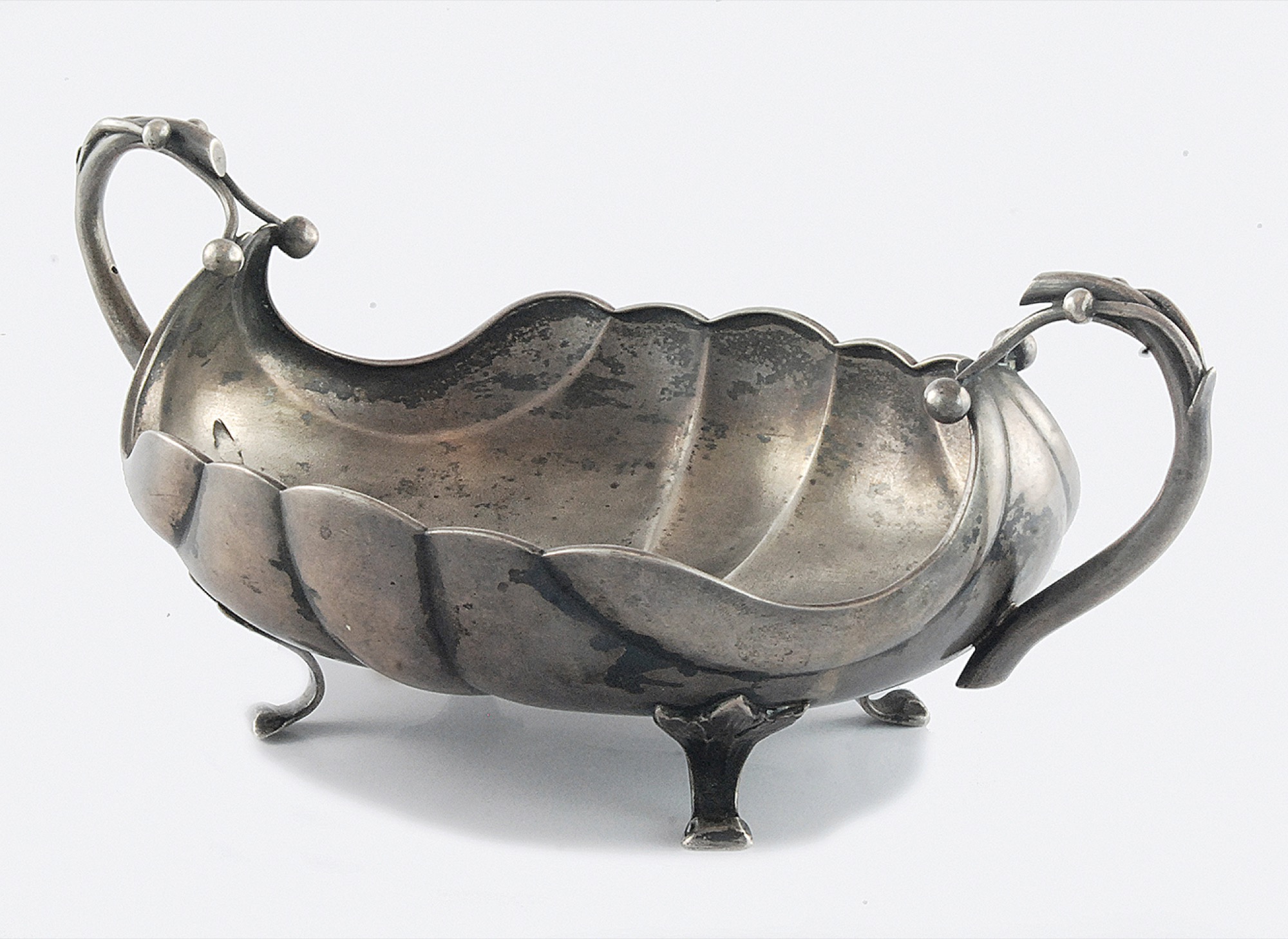 Owalna, wsparta na czterech wygiętych nóżkach, żebrowana, z dwoma uchwytami po bokach w formie stylizowanych gałązek z kolistymi owocami.