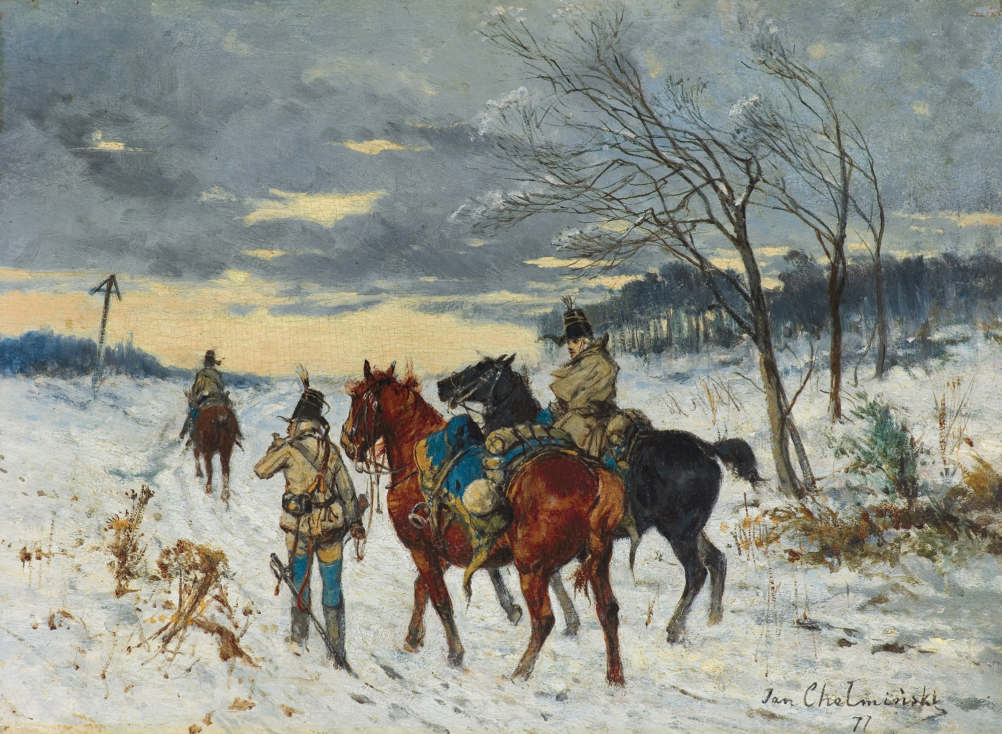 Jan Chełmiński (Brzustów k. Opoczna 1851 – Nowy Jork 1925) popularny malarz z kręgu „polskich monachijczyków“, naukę rozpoczął u Juliusza Kossaka, a następnie kształcił się w warszawskiej Klasie Rysunkowej oraz w Monachium - w Akademii u Alexandra Strähubera i Alexandra Wagnera (1873-1875) i prywatnych pracowniach Józefa Brandta (1875) i batalisty Franza Adama (1876). Po studiach przebywał już stale za granicą - w Monachium, Londynie (lata 1882, 1888-1899), Paryżu (1899), jeździł do Petersburga (1889) i Nowego Jorku (1884), gdzie później, około 1915 zamieszkał na stałe. Nie zerwał jednak kontaktów z krajem, a swoje prace często przesyłał na warszawskie wystawy. Jego obrazy cieszyły się ogromnym powodzeniem. Malował przede wszystkim sceny wojskowe i batalistycznie, najchętniej z czasów Księstwa Warszawskiego i wojen napoleońskich, a także obrazy rodzajowe i epizody z polowań. Zajmował się ilustracją książkową; m.in. ilustrował tom myśliwskich opowiadań Theodora Roosevelta. Był kolekcjonerem dawnej broni i wybitnym znawcą żołnierskiego umundurowania. Wiele obrazów artysty wciąż znajduje się za granicą - w Anglii, Niemczech czy Stanach Zjednoczonych. Nieliczne z nich pojawiają się w sprzedaży antykwarycznej, stale budząc żywe zainteresowanie zbieraczy.