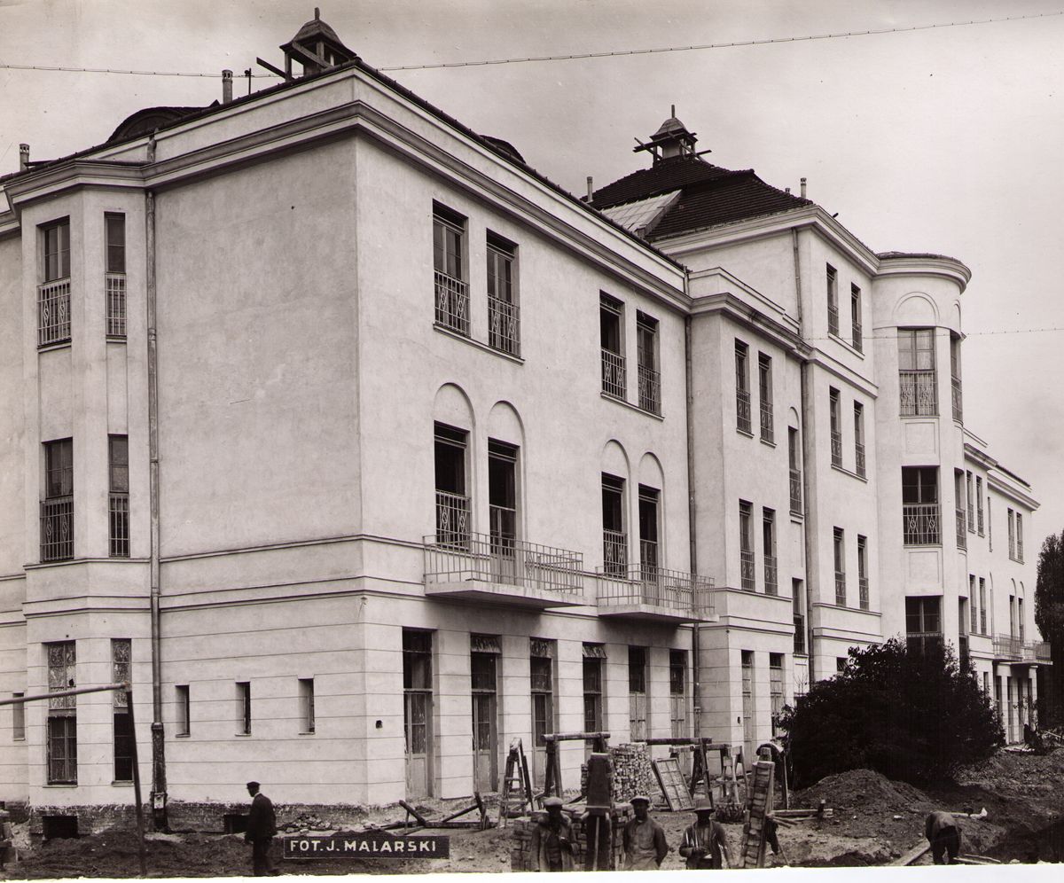 Na odwrocie stempel: Agencja Fotograficzno-Prasowa / Jan Malarski / Chmielna 10, tel. 224-20 / Prawo reprodukcji zastrzeżone; piórem: pawilon obserwacyjno-zakaźny w szp. Św. Stanisława