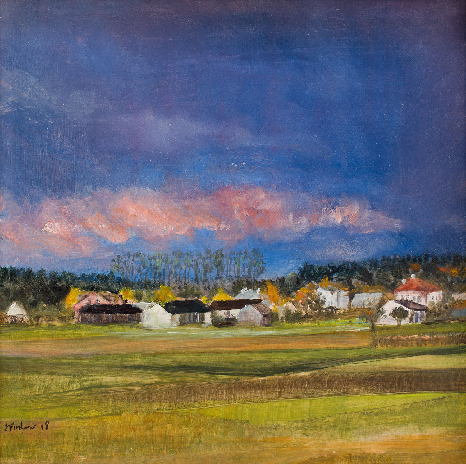 olej/deska, 24,5 x 24,5 cm (w świetle oprawy) sygnowany i datowany l.d.: 'A Fic Lazor 18' na odwrociu opisany: 'A. Fic-Lazor | 2018 | olej, deska, jesion | październikowe niebo | 25,8 x 26'