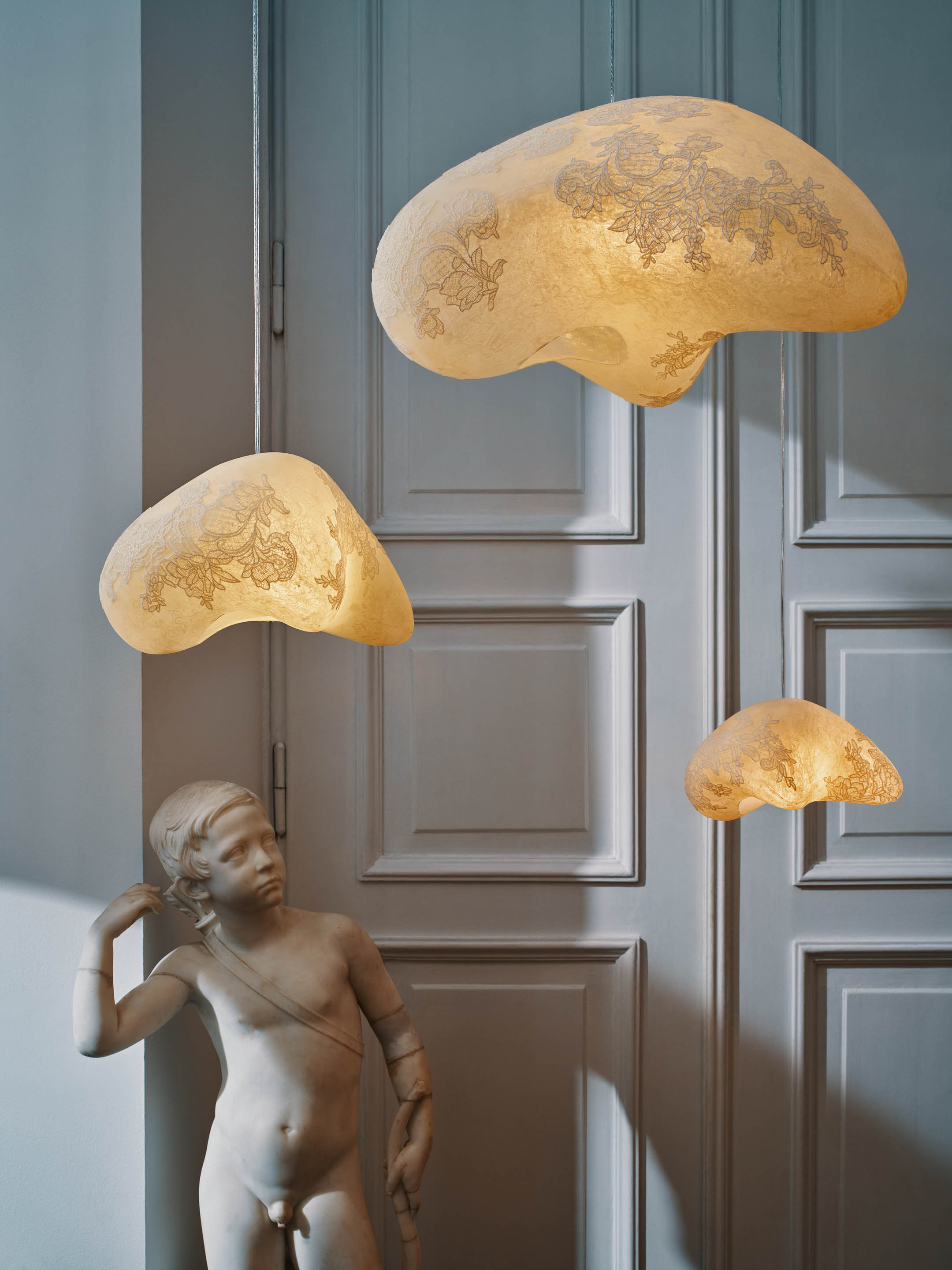 W mojej twórczości kilkukrotnie mierzyłam się z łączeniem wzorów koronek ze światłem, pozwalając, by ich dekoracyjność była dominująca. Tym razem to forma lampy, zaprojektowana przez Marka Bimera, skłoniła mnie do bardziej minimalistycznego podejścia do dekoracyjnych detali. Koronki stają się tu jedynie punktem wyjścia do opowieści o ornamentyce, poezji, delikatności i pięknie. Na pierwszych zdjęciach lampy wyglądały jak świetliste perły unoszące się w nocnej przestrzeni, tytuł pracy był więc oczywisty.