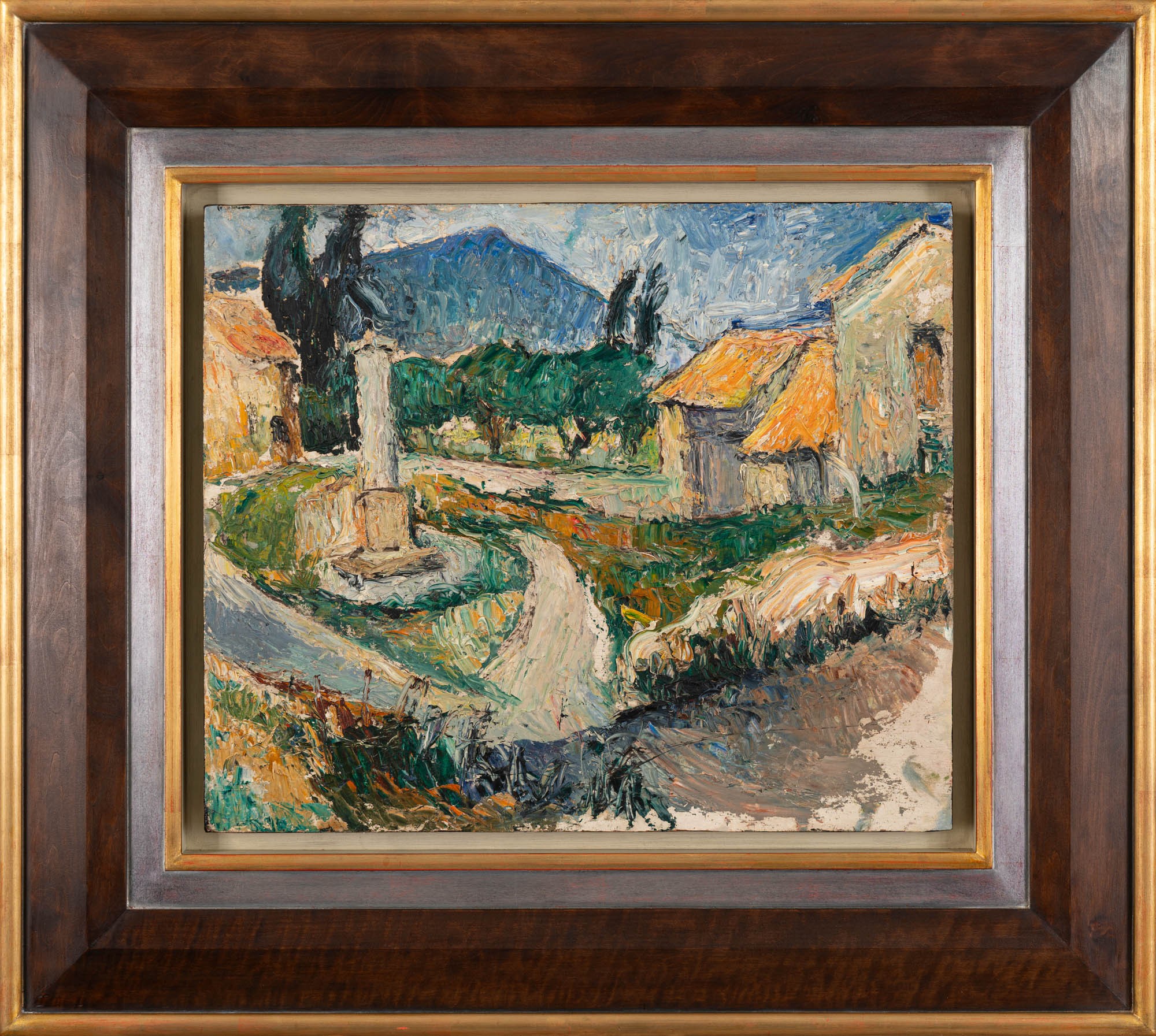 Proponowana kompozycja posiada rozpoznawalne cechy stylu malarki, tworząc przy tym wysmakowaną artystyczną całość. Muter eksperymentując z plamami koloru, śmiało połączyła oranże, żółcienie z chłodnymi odcieniami błękitu i zieleni. Małomiasteczkowy klimat dodaje uroku i dekoracyjności dziełu. Proweniencja obrazu obejmuje m.in. galerie sztuki z Genewy i Kolonii, świadcząc o międzynarodowym uznaniu tej kompozycji.