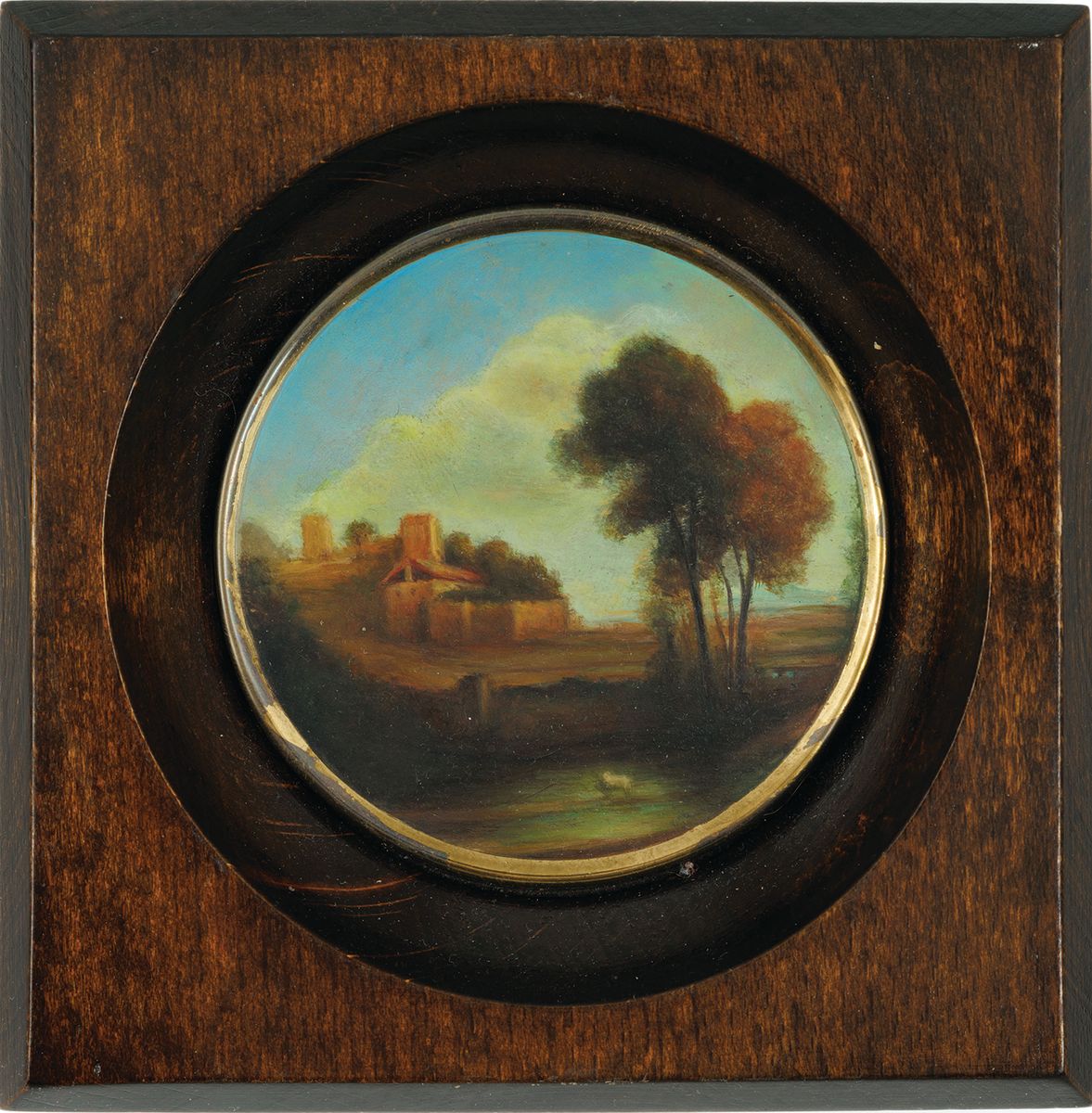 Miniatura, olej, deska; śr. 85 mm