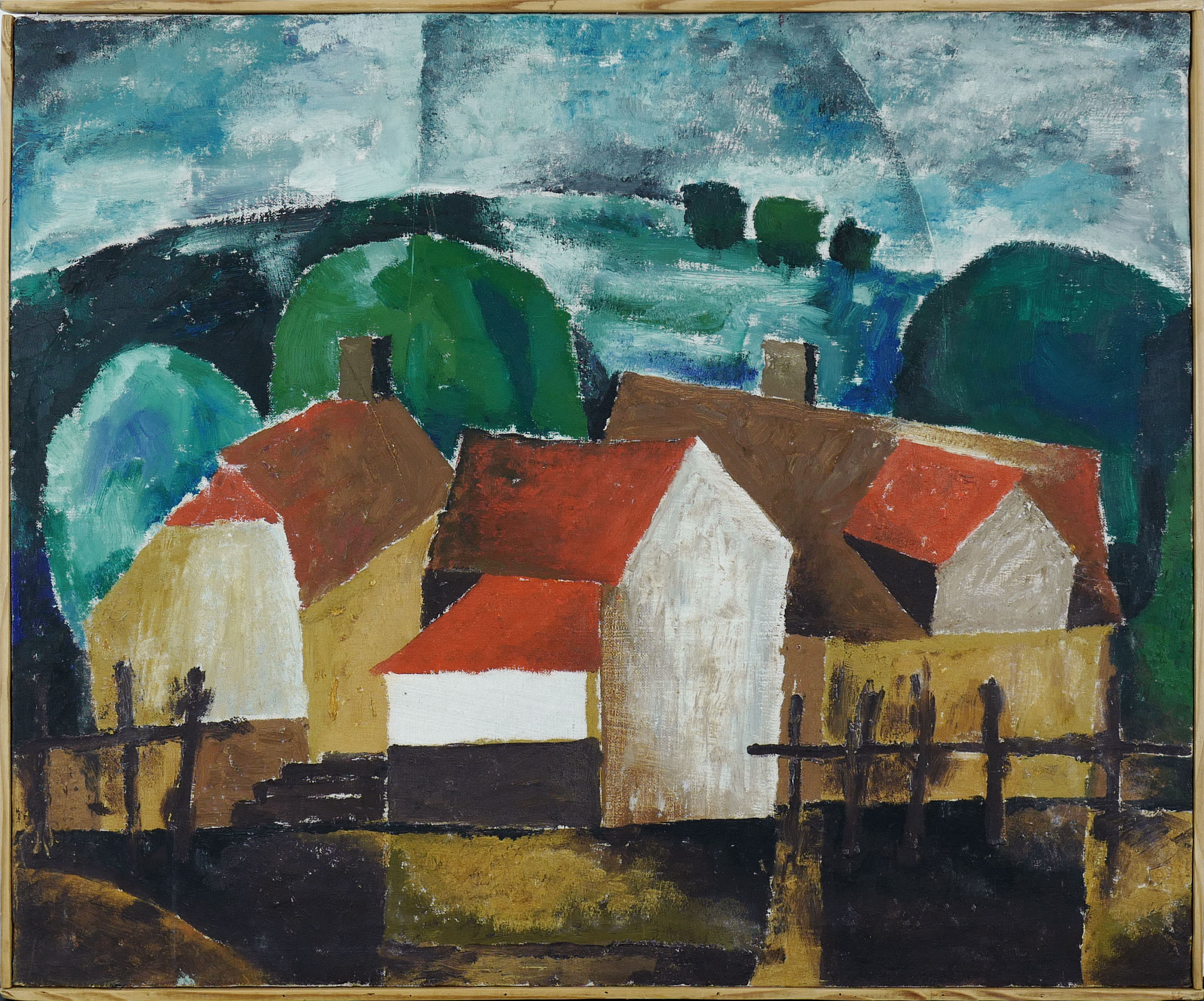Pejzaż kubistyczny, ok 1950 - 1960 r.olej, płótno51 x 62 cmsygn. na odwrocie na blejtramie: CYBULSKI DANIEL