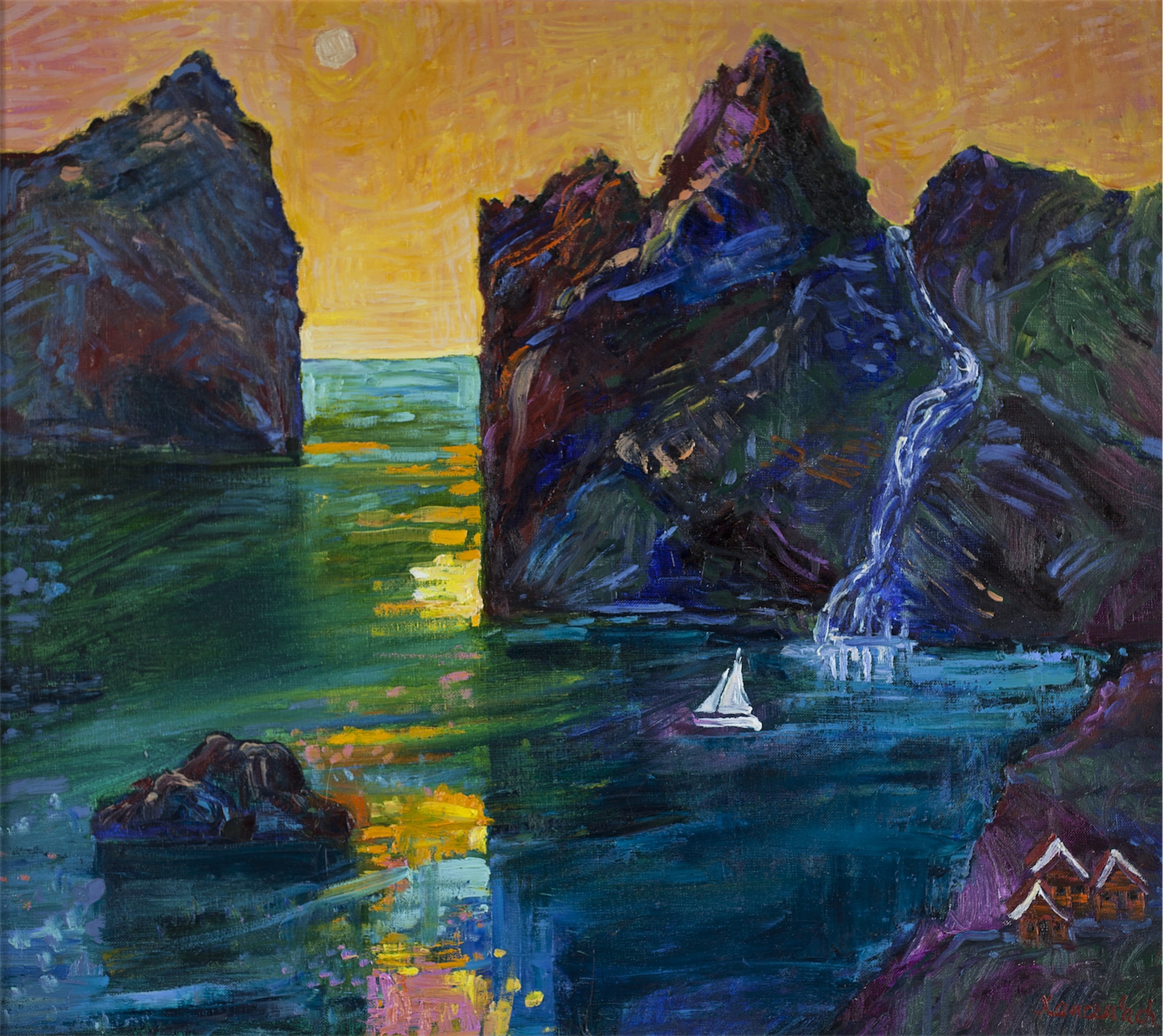 olej, płótno; 87 x 97 cm;sygn. p. d.: Xancenbach;na odwrocie autorski opis: JAN SZANCENBACH/ PEJZAŻ NORWESKI/Z ŁÓDKĄ/ 1997* opłata droit de suite