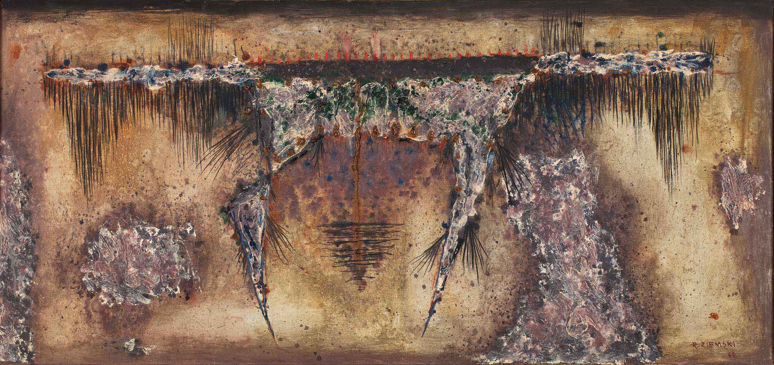 sygn. p.d.: R. ZIEMSKI / 60, sygn. i opisany na odwrociu: RAJMUND ZIEMSKI / PEJZAŻ PRZESTRZENNY / 70 X 140 / 1960