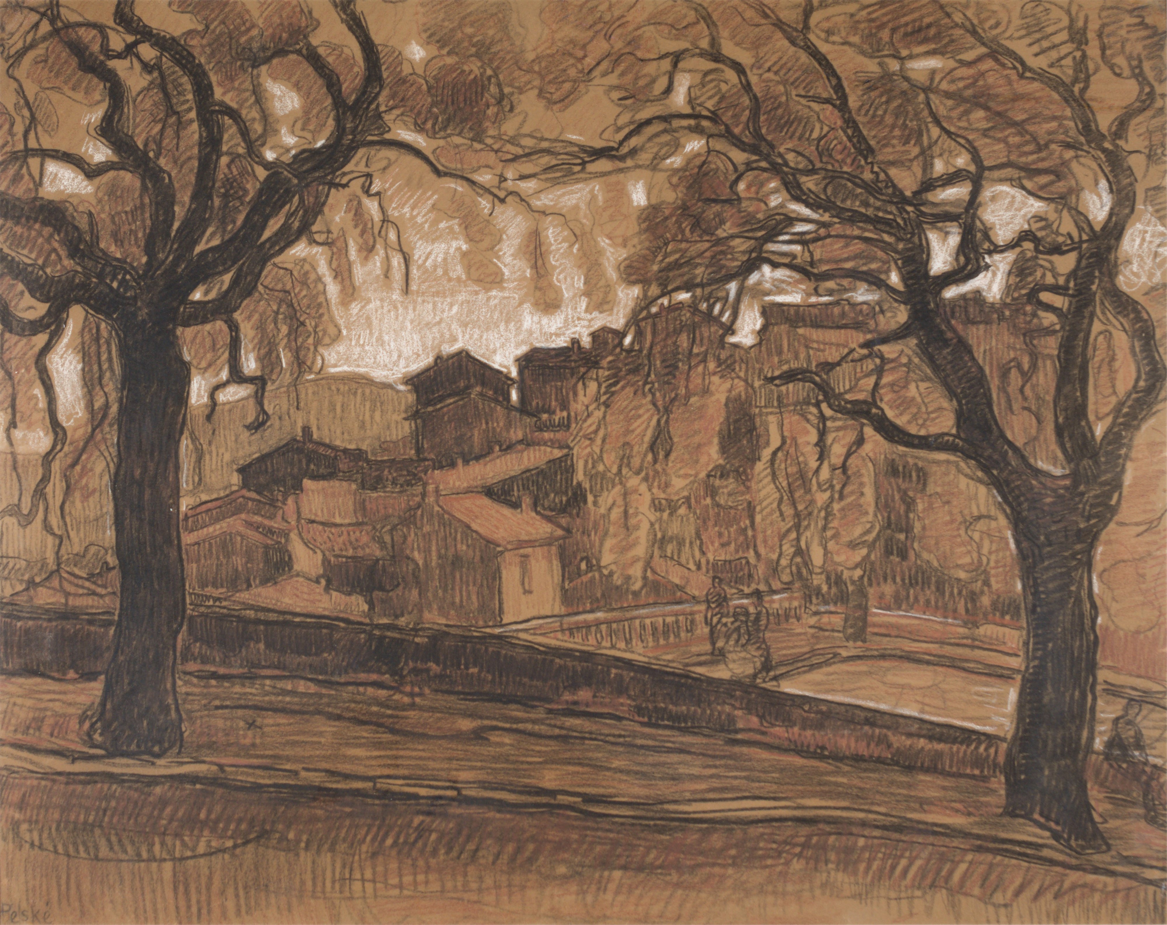 technika mieszana: kredka, gwasz, węgiel, papier; 62 x 77,5 (w św. passe-partout);sygn. l. d.: Peske.