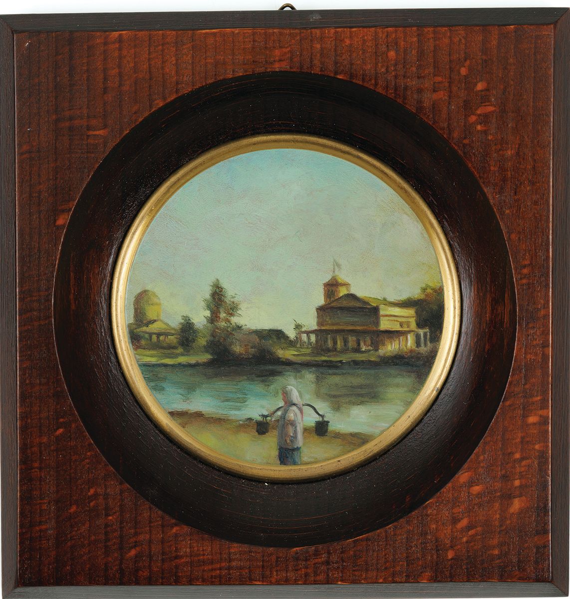 Miniatura, olej, deska; śr. 85 mm