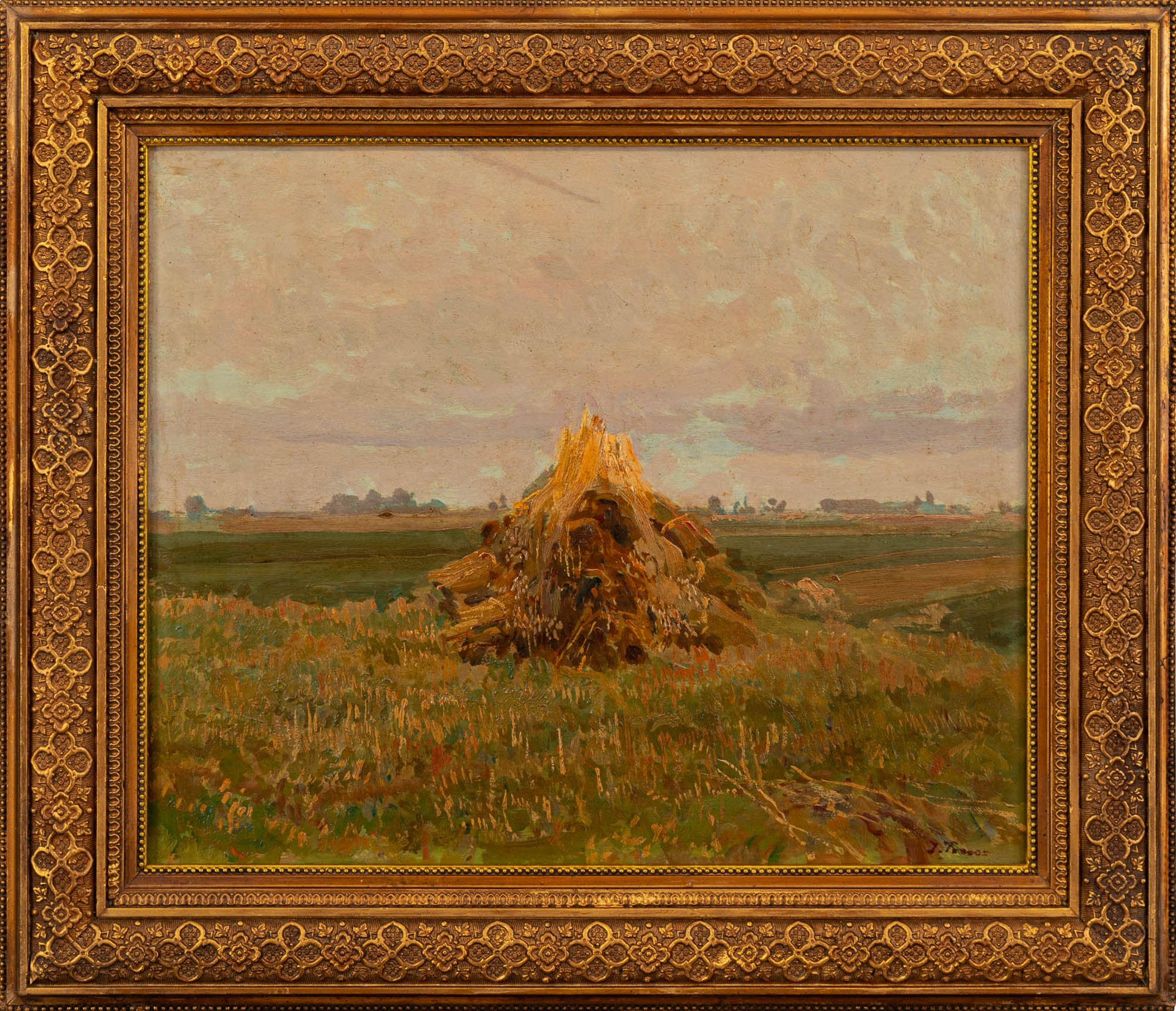 Pejzaże to najważniejsze motywy malarskie Iwana Trusza. W jego kompozycjach można uchwycić nastrój kontemplacji i wyciszenia. Harmonijnie dobrana paleta kolorystyczna była typowa dla jego dzieł szczególnie w dojrzałym okresie twórczości. Nasycone, czyste barwy potęgują intensywność odbioru natury uchwyconej przez malarza: zachodów słońca, dostojnych drzew czy stogów siana. Te elementy przyrody nieraz powracały na obrazach artysty, a ich powtarzalność stawała się okazją do malarskich studiów nad światłem i kolorem - odmiennych w zależności od pory roku czy dnia. Oferowany obraz to sztandarowy przykład artystycznej wrażliwości Iwana Trusza. Wyraziste pociągnięcia pędzla o różnej intensywności, budują fakturę obrazu. Świetliste kolory i rozpoznawalny motyw tworzą dekoracyjną całość.