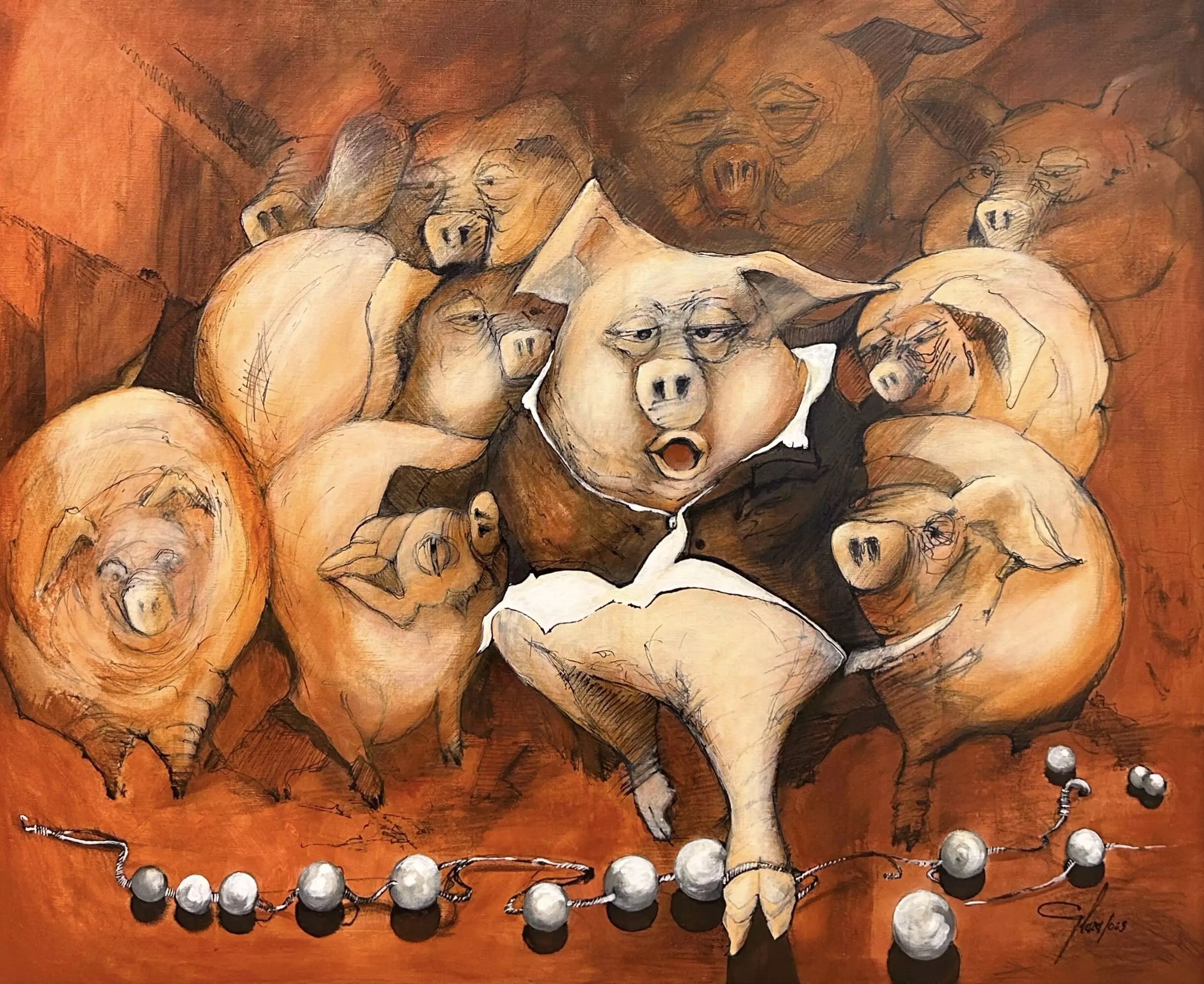 Technika mieszana na płótnie, akryl, 100×120 cmsygnowany p.d.: ,,Glaza 2023''sygnowany na odwrociu: ,,PERŁY PRZED WIEPRZE, CYTAT (JEZUS CHRYSTUS), AKRYL TECH-MIESZANA -RYSUNEK-, Tomasz Glaza, 023.''