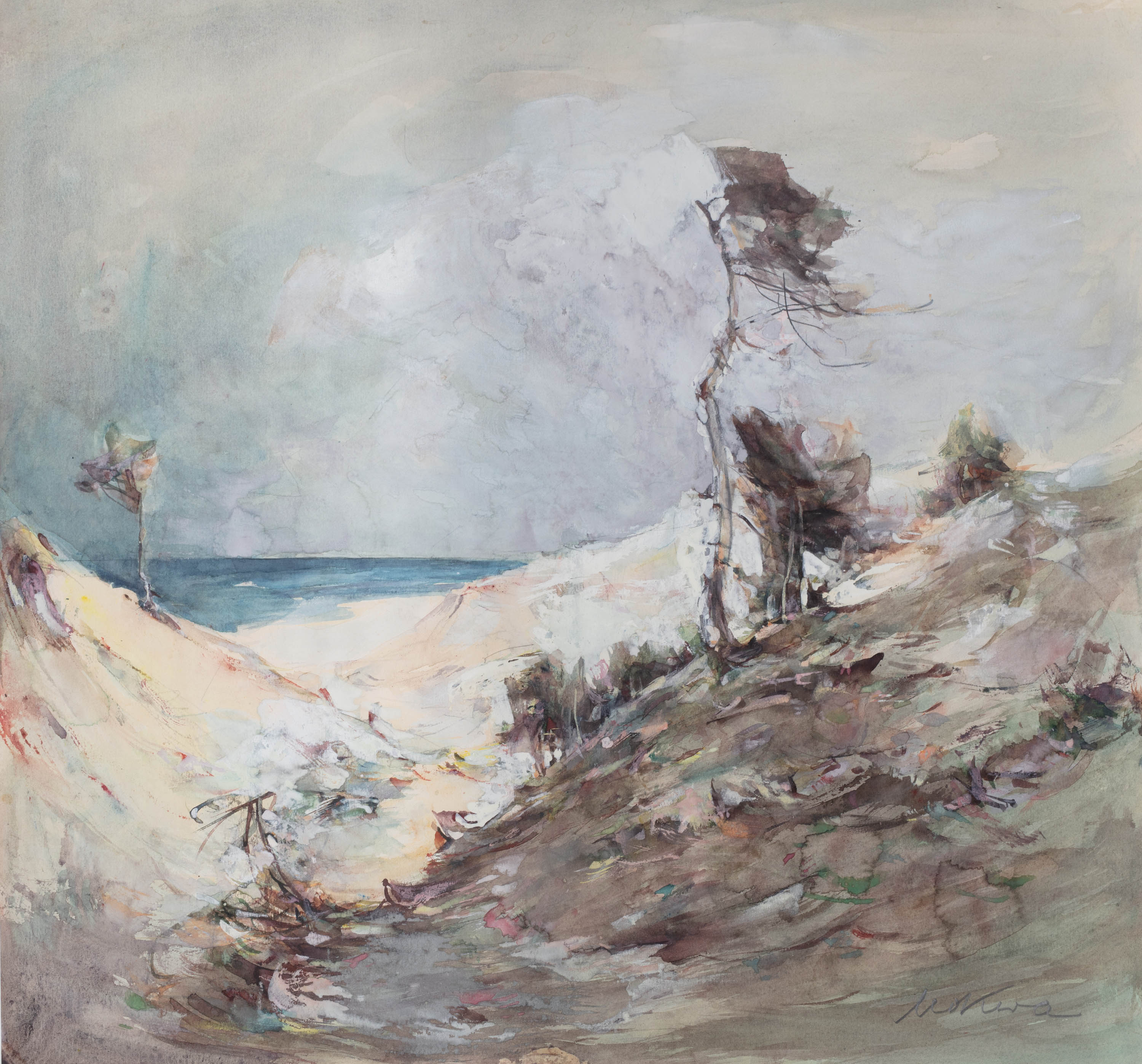 na odwrocie nalepki: 1. ROYAL SOCIETY OF BRITISH ARTISTS/NAME M.MOKWA/ ADDRESS/BOURLET./Title of Picture Sand Dunes - Poland/Price in Guineas 30 2. JAMES BOURLET & SONS, Ltd. |Frame Makers &Packers/PICTURES RELINED, CLEANED & VARNISHED/Artist M.Mokwa/Address ..../Price.../Title of work .../Ref. No. 26164 Date.../17&18, Nassau Streer. LONDON. W1 3. SOUTHPORT/196 (5?)/James Bourlet & Sons, Ltd/17-18 Nassau St London/Tel. Nosa MUSEUM 1871-7588.