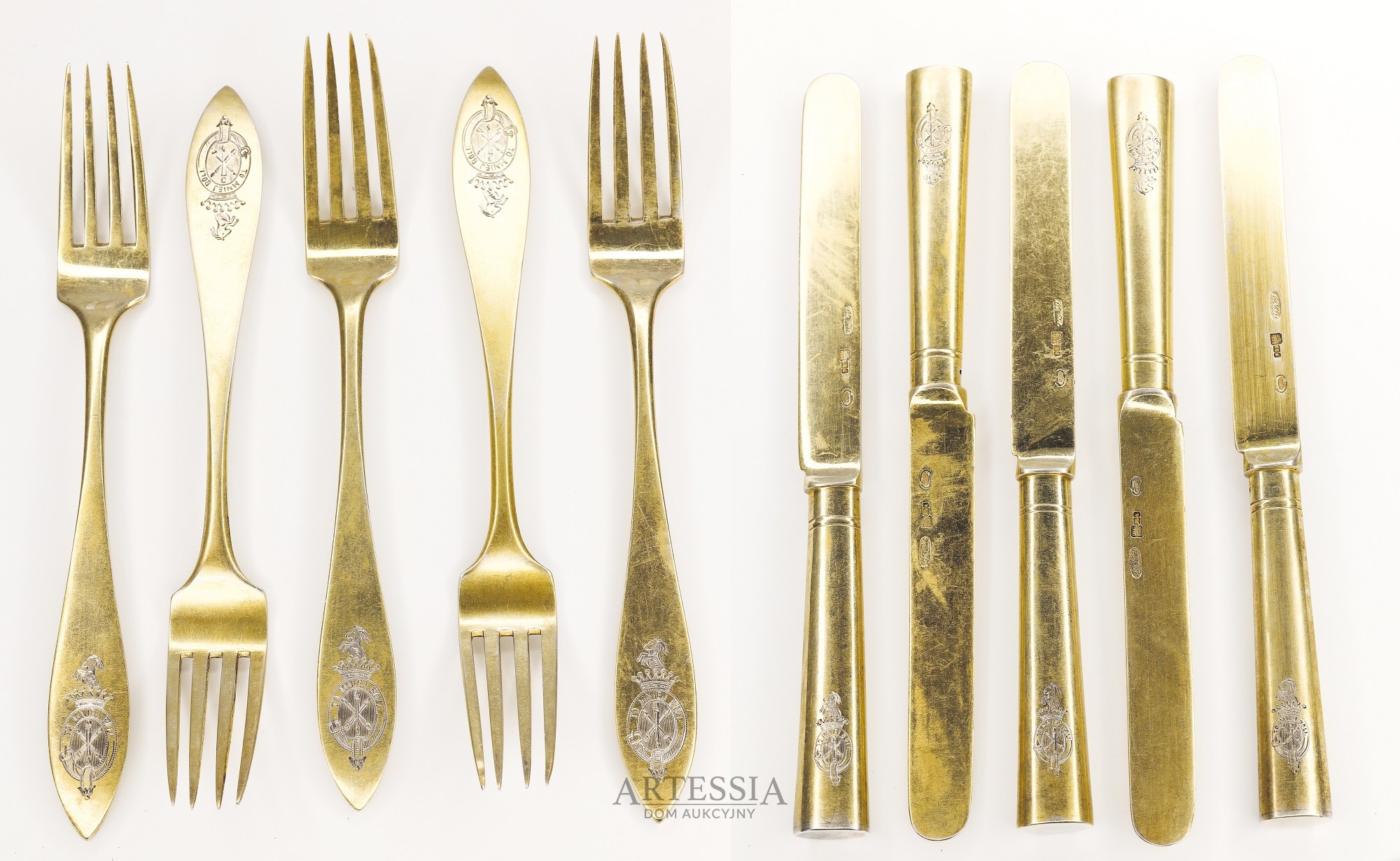 srebro złocone (vermeil), noże dł. 19 cm, widelce 17,5 cm, waga 255 g;