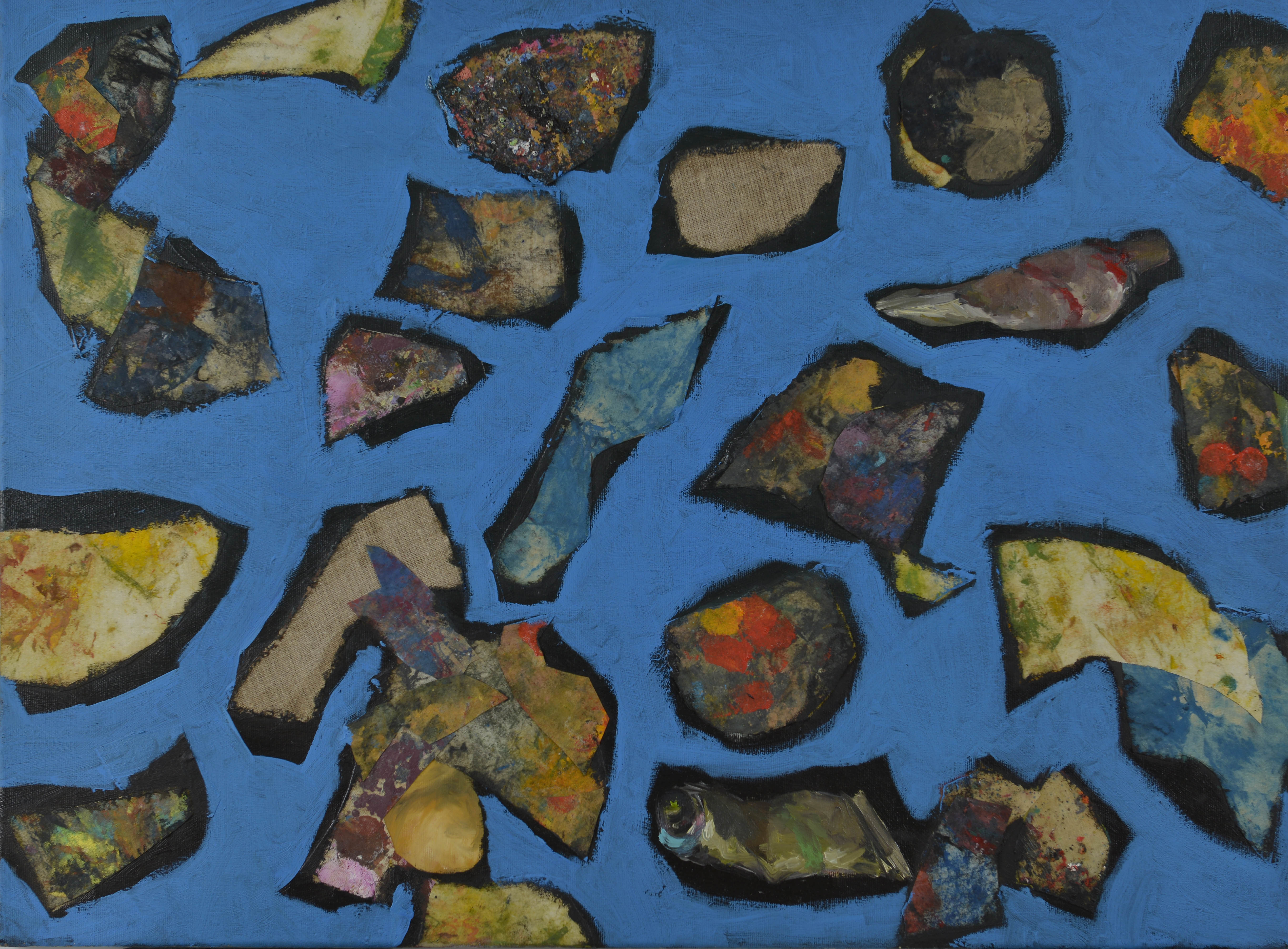kolaż, olej na płótnie, 34 x 73 cm, sygn.