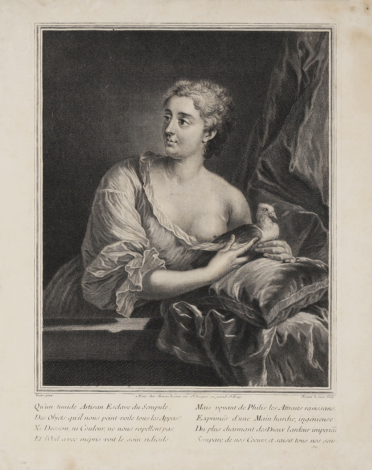 Grafika wykonana wg obrazu Jeana Baptisty van Loo (1684-1745). Posiada w dolnej części romantyczny wiersz o pięknie i miłości. Niezwykle rzadka grafika, posiada ją tylko Biblioteka Narodowa Portugalii (w gorszym stanie niż ta oferowana) i Muzeum księcia Antoniego Ulricha w Brunszwiku. Nie była też od 25 lat na aukcjach.