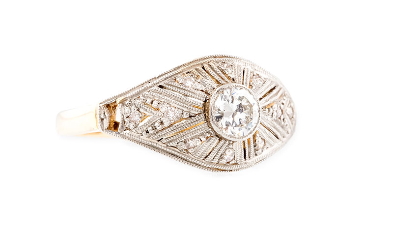 l. 20.-30. XX w.złoto p. 0,580, platyna, m. 3,19 g, brylant w starym szlifie 0,35 ct, 10 szt. brylantów łącznie ok. 0,10 ct