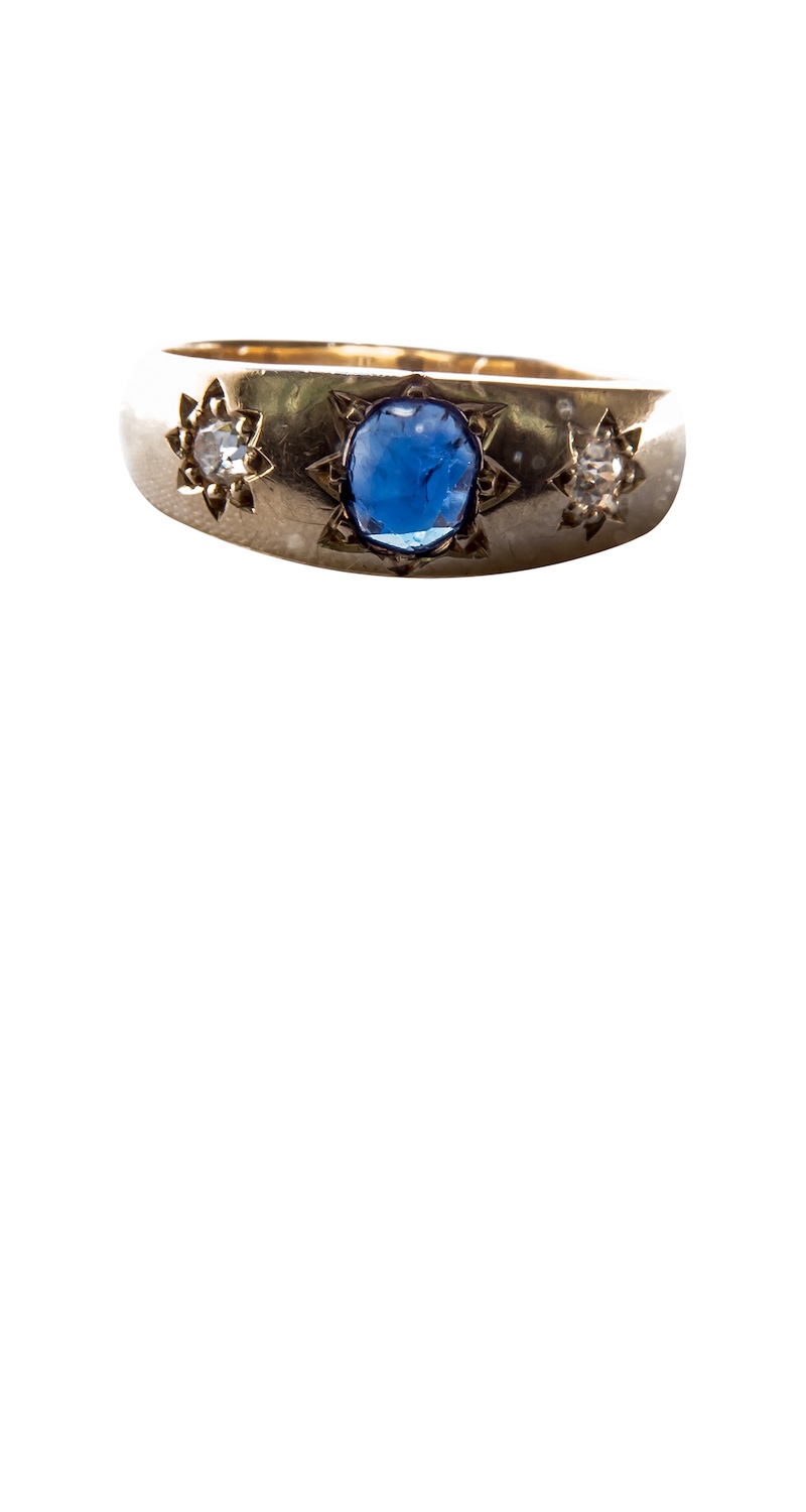 Au. 0,585 o masie: 3,83 g.1 szt. szafir w szlifie owal fasetowanyo masie ~0,50 ct.2 szt. diamenty w starych szlifach 16/16o łącznej masie ~0,12 ct.