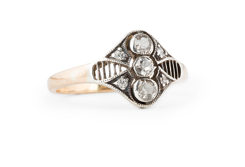 l. 20.-30. XX w.złoto p. 0,583, srebro, m. 2,46 g, 7 szt. diamentów w starym szlifie łącznie ok. 0,30 ct, J-K/VS-P