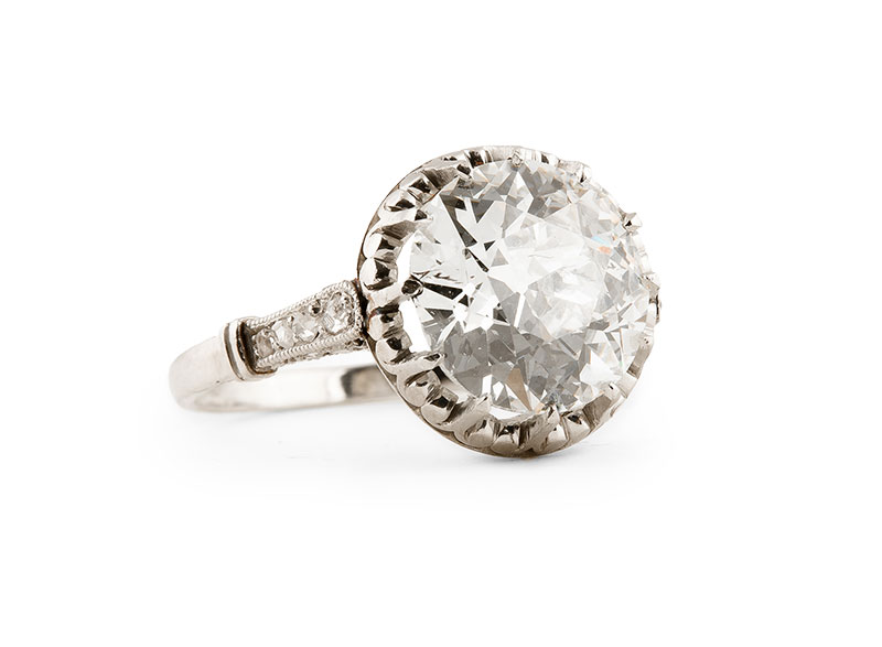 platyna, złoto, m. 5,95 g, brylant 4,90 ct, VS2/M-N (barwa szampańska), 18 szt. rozet i rautów diamentowych, stary szlif