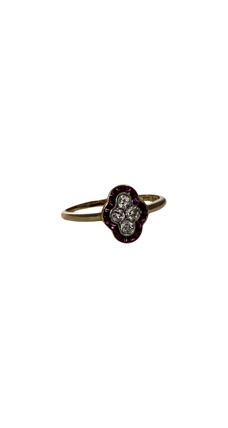 Au. 0,585 + Pt. 0,950 o masie 1,97 g.4 szt. diamenty w szlifach 16/16 o łącznej masie ~0,30 ct.20 szt. rubiny w szlifach bagiet kwadrat i trapezo łącznej masie ~0,30 ct.