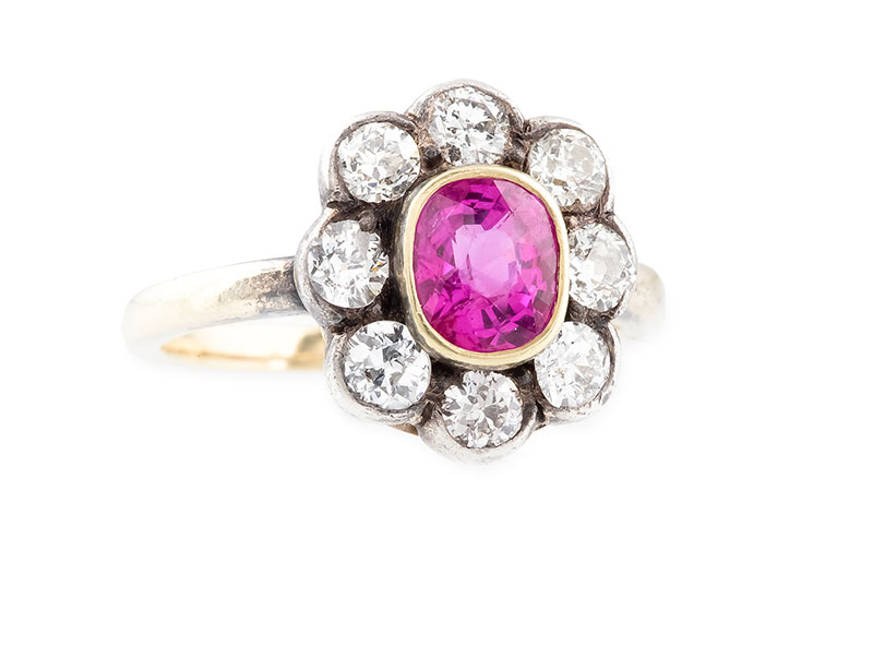 Wiedeń, XIX/XX w.złoto p. 0,580, srebro, m. 3,47 g, rubin ok. 1,10 ct, 8 brylantów w starym szlifie, łącznie ok. 0,80 ct