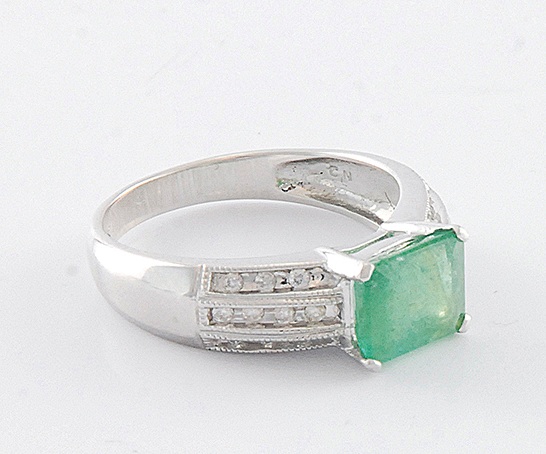 centrum kompozycji stanowi prostokątny szmaragd o wym. 8 x 6.1 mm oraz 20 szt diamentów formy okrągłej obsadzonych po obu jego stronach w szynie o masie łącznej 0.15 ct (Si- Si1G-J), złoto pr. 0.583, masa całkowita 3.250 g.