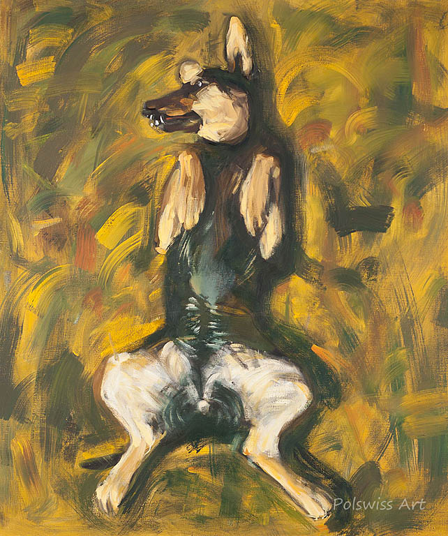 Olej, płótno;130 x 110 cmSygn. na odwrocie: ANDRZEJ/ ZUJEWICZ/ "PIES", "ZWIERZĘTA/ DOMOWE"/ 1999/ 130 x 110 / olej