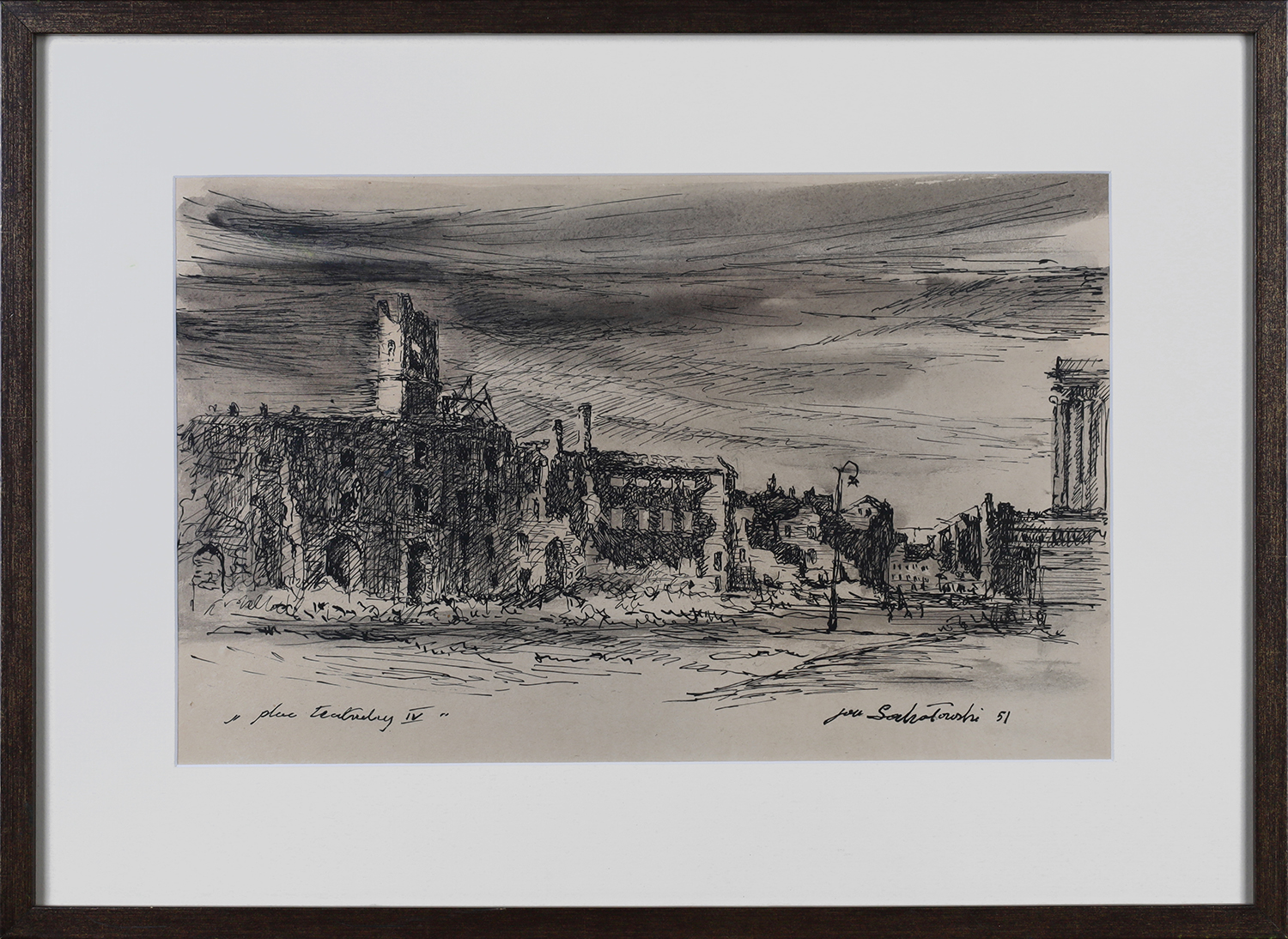 piórko, tusz, tusz lawowany, papier, 26,2 x 38,5 cm,sygn. p.d.: Jan Sokołowski 51; l.d.: "plac teatralny IV"