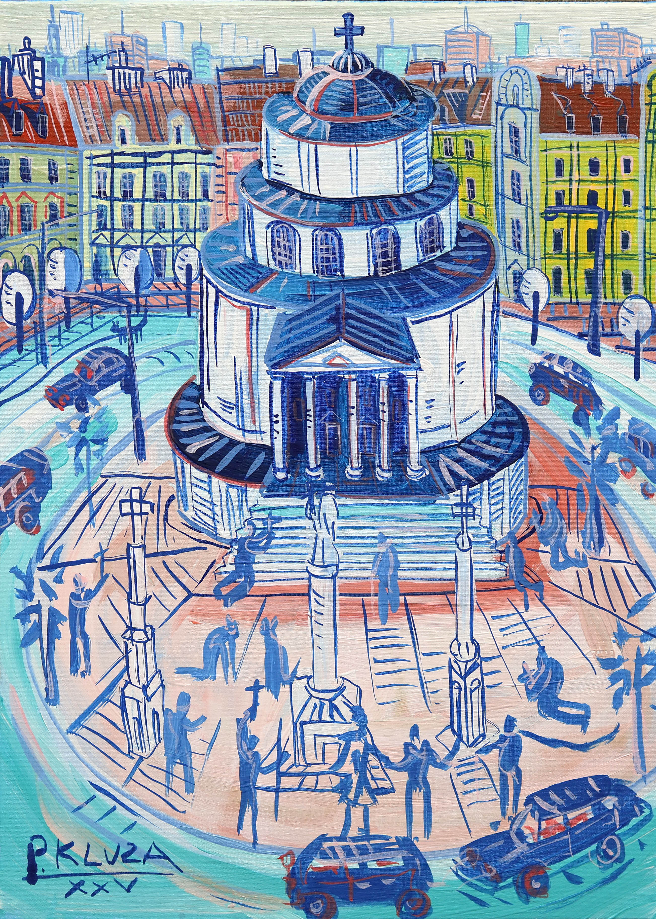 akryl na płótnie, 24 cm x 33 cm; sygnowany z przodu, l.d.: P.KLUZA / XXV; sygnowany, datowany i opisany na odwrocie: P. KLUZA/ ''Plac Trzech Krzyży''/ NR.: 4840 / XXV; dołączony certyfikat autorski