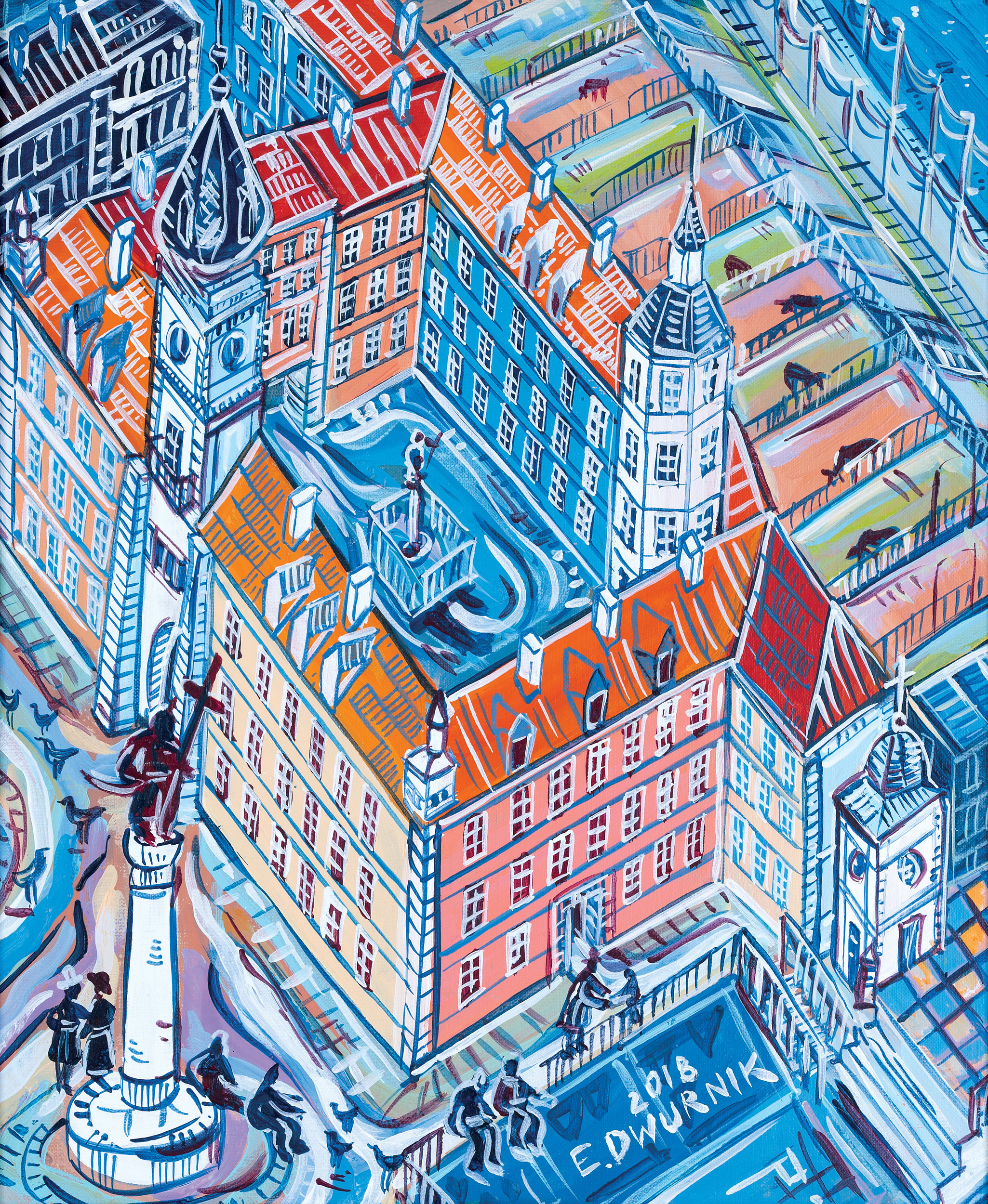 akryl, płótno55 x 46 cmsygn. p.d.: 2018 | E. DWURNIKsygn. na odwr. śr. g.: 2018 | E.DWURNIK | “PLAC ZAMKOWY” | NR: IX [w ramce] - 946 - 7864w l.d. rogu przytwierdzony certyfikat autentyczności podpisany przez autora