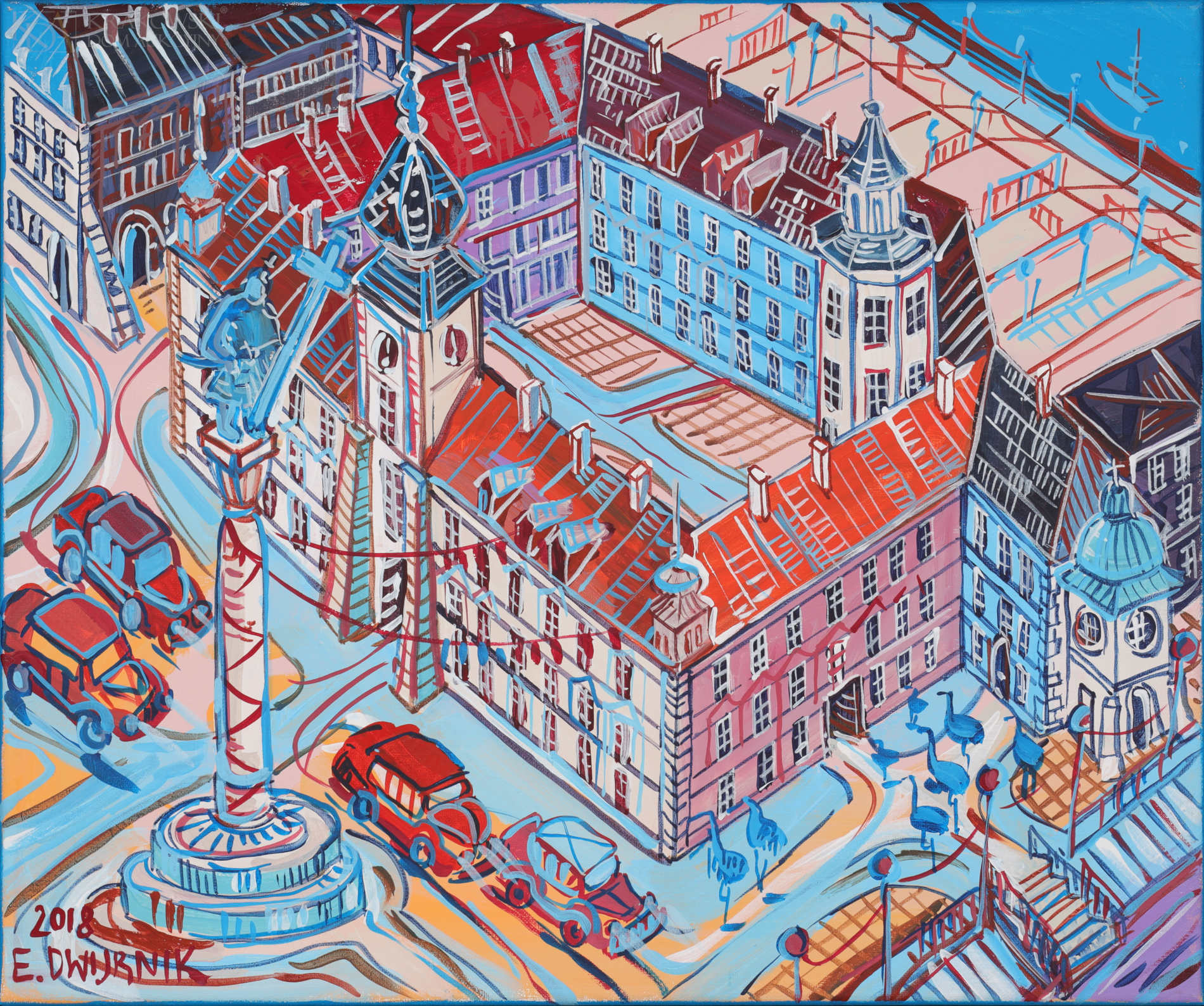 olej, akryl, płótno 46 x 55 cm; 50 x 59 cm (z oprawą) Sygn. i dat. l.d.: "2018 | E. DWURNIK" Opisany na odwrocie: "2018 | E. DWURNIK | PLAC ZAMKOWY | NR: XI - 885 - 7396" Do obrazu dołączony certyfikat autentyczności wydany przez Edwarda Dwurnika.
