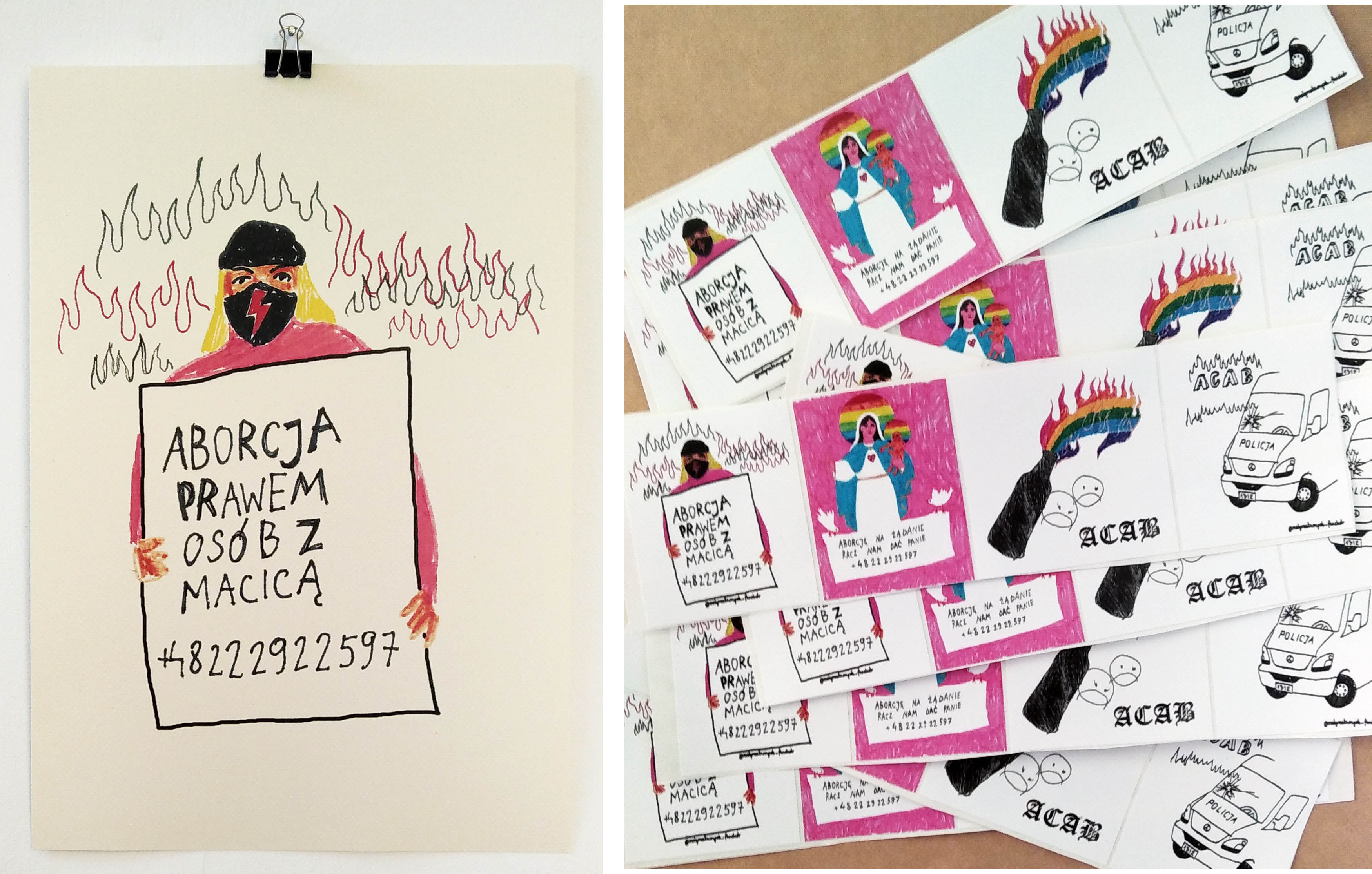 Format A3. Druk cyfrowy na papierze 200g eko crush z kukurydzy. Bez oprawy. Sygnowany na odwrocie. W pakiecie: Zestaw 40 wlepek z ilustracjami artystki - dwa wzory pro abo i dwa ACAB.