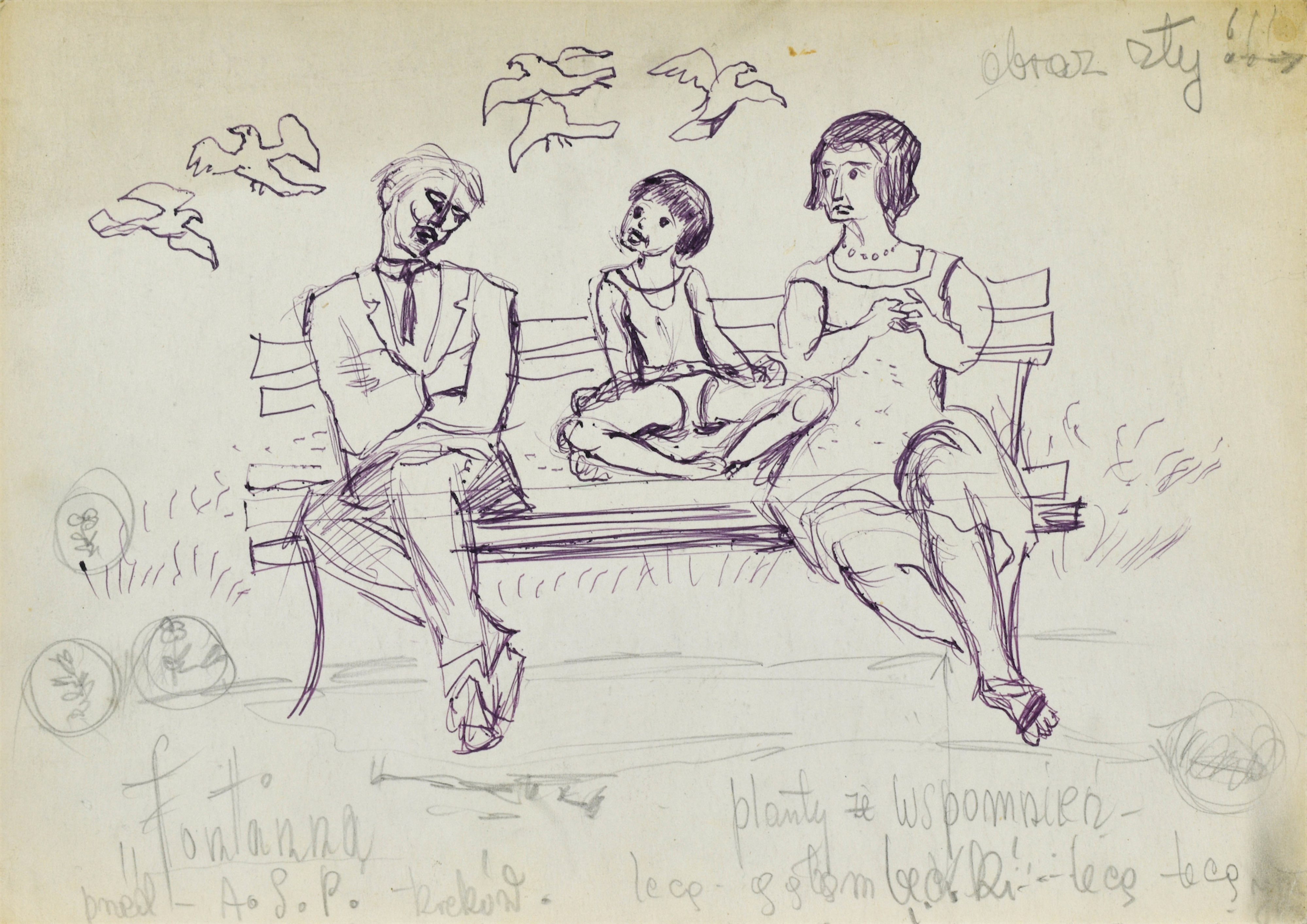 sygnowany u dołu z prawej: JMŁ (częściowo zatarte, ołówkiem);w obrębie pracy napis autorski ołówkiem (pisownia oryginalna): u góry z prawej obraz zły! obok wektor skierowany w prawo, u dołu: z prawej planty - Wspomnienia / lecą gołombecki - lecą - lecą, z lewej „Fontanna” / przed - A. S. P. - Kraków;