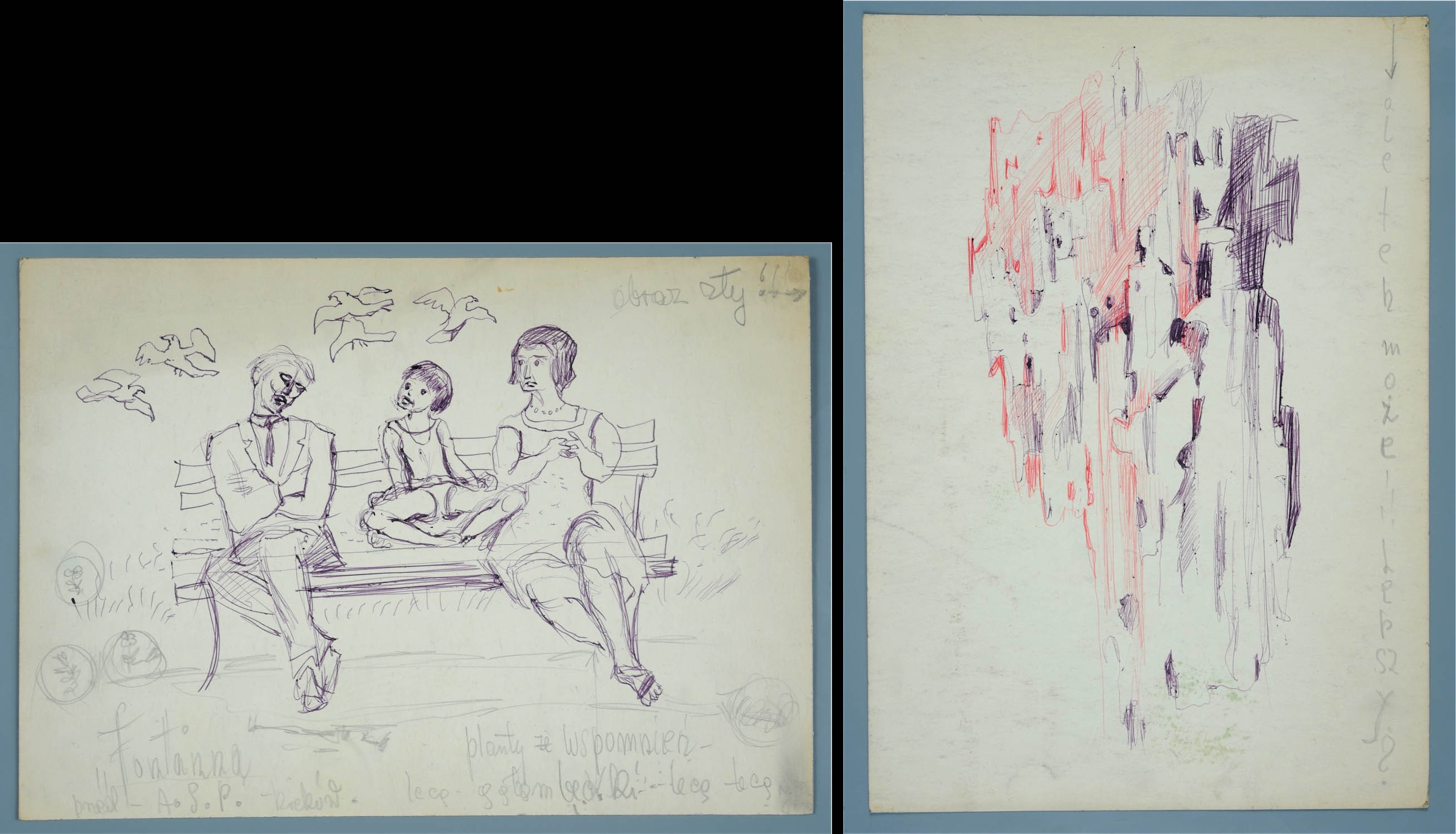 w obrębie pracy napis autorski ołówkiem (pisownia oryginalna): u góry z prawej obraz zły! obok wektor skierowany w prawo, u dołu: z prawej planty – Wspomnienia / lecą gołombecki – lecą – lecą, z lewej „Fontanna” / przed – A. S. P. – Kraków;