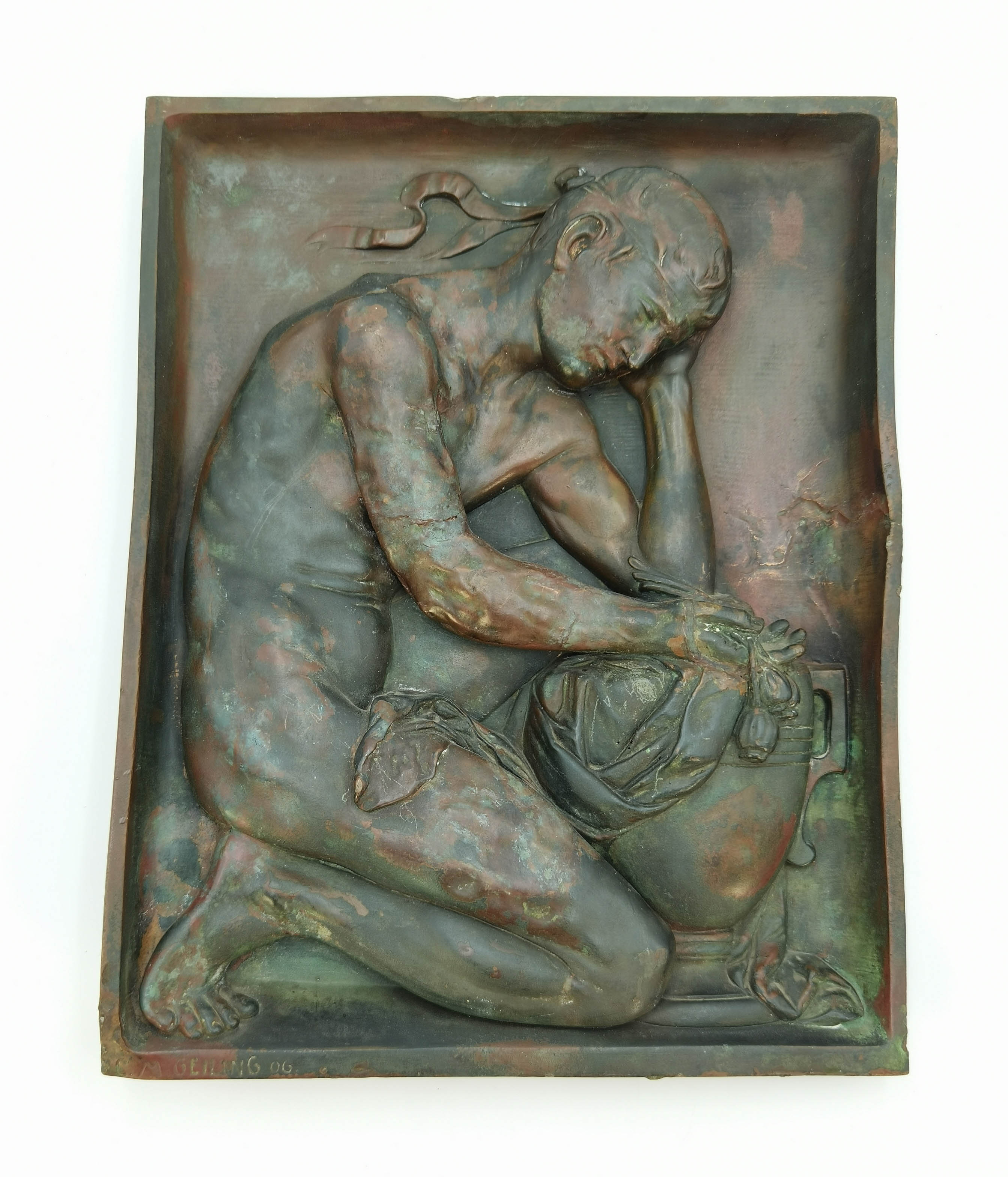 Plakieta z reliefem wyobrażającym klęczącego, nagiego mężczyznę pochylonego w zadumie nad stojącym przed nim dzbanem.