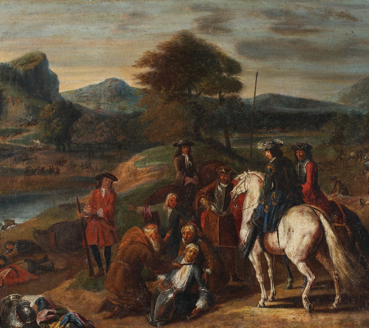 Na pierwszym planie autor przedstawił pobojowisko i ostanie namaszczenie rannego żołnierza, któremu asystuje konno dowódca. Obraz jest bliski stylowi Adama Fransa van der Meulena.