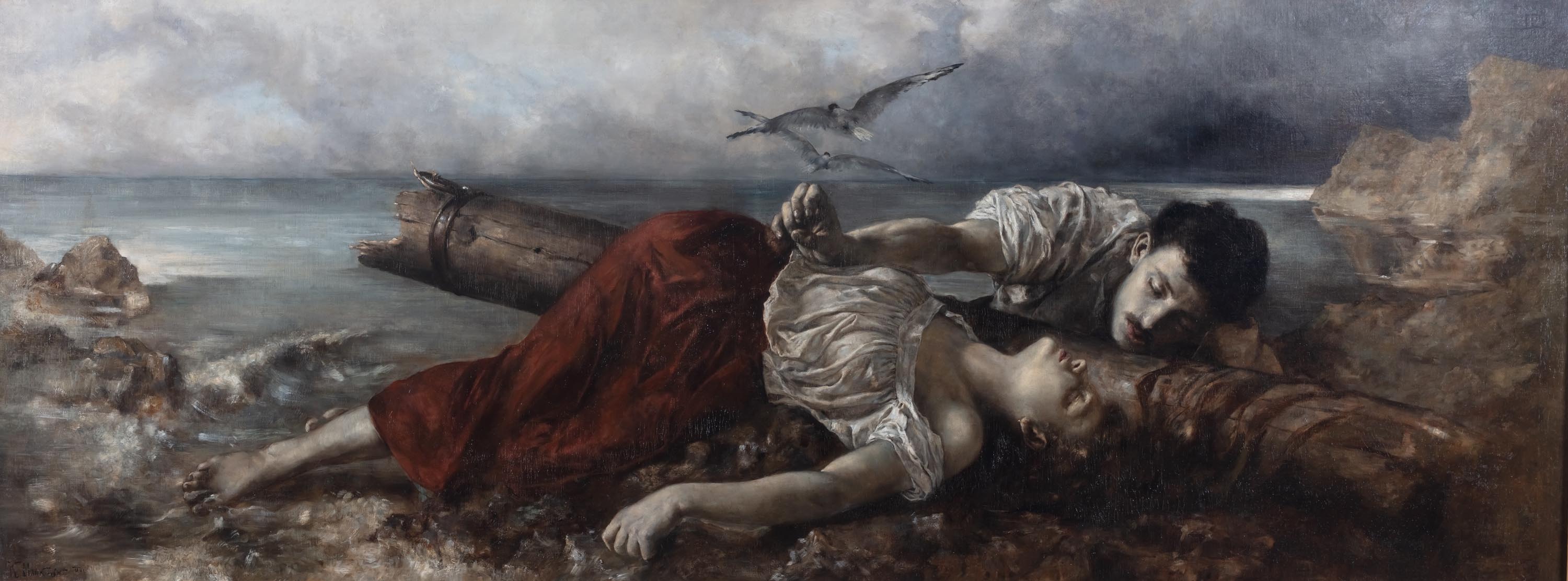 Monumentalne dzieło Konstantego Mańkowskiego „Po burzy morskiej”, znane również pod alternatywnym tytułem „Rozbitki”, to przejmująca scena będąca wizualnym echem dziewiętnastowiecznej literatury. W szczególności tej, której motywem przewodnim była miłość i jej wpływ na losy głównych bohaterów. Obraz powstał w okresie studiów artysty na Akademii Sztuk Pięknych w Wiedniu. Należał do grupy czternastu Polaków kształcących się wówczas w Wiedniu. Profesorem, pod okiem którego doskonalił swój warsztat malarski był Hans Makart – ceniony przez polskich odbiorców sztuki, czego dowodem były organizowane wystawy jego prac w polskich instytucjach oraz ich reprodukcje zamieszczenie w polskiej prasie II połowy XIX wieku. „Po burzy morskiej” („Rozbitki”) był jednym z trzech obrazów, które Konstanty Mańkowski zaprezentował na Wystawie Nieustającej krakowskiego Towarzystwa Przyjaciół Sztuk Pięknych w Sukiennicach w 1883 roku. Wystawiono: „Studium Włocha”, „Pierwszy liścik” oraz „Po burzy morskiej”. Gazeta krakowska „Czas” w numerze 201 z dnia 5 września 1883 roku w dziale „Wiadomości artystyczne, literackie i naukowe” podaje tytuł prezentowanej pracy jako „Rozbitki”. Dzieło zostało zakupione przez TPSP do rozlosowania pomiędzy członków krakowskiej instytucji, a jej właścicielem został Bolesław Sławoszewski. Z upływem lat obraz powrócił do kolekcji rodziny artysty. Prezentowany obraz to jeden z najważniejszych obrazów malarza. Alfred Świeykowski określił „Po burzy morskiej” jako jeden z pięciu najlepszych płócien Mańkowskiego . Pozostałe to: „Św. Piotr wskrzeszający dziewicę” ,„Z dziejów Komuny”, „W południe” i „Mandolinata”. (Jolanta Polanowska, „Słownik artystów polskich i obcych w Polsce działających (zmarłych przed 1966 r.) malarze, rzeźbiarze, graficy”, t. V, Le-M, Warszawa 1993).