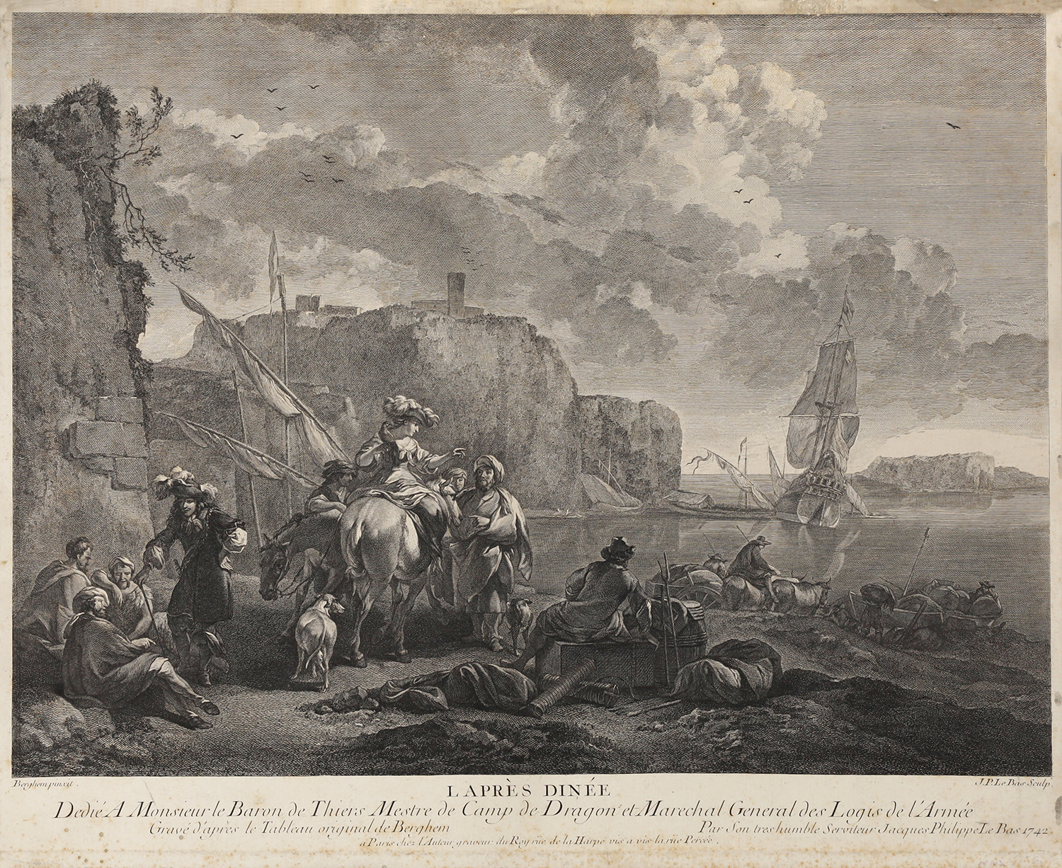 Grafika wykonana wg obrazu Nicolaesa Berchem (1620-1683). Pod rysunkiem dedykacja dla Louisa Crozat barona de Thiers (1700-1770), kolekcjonera i wyższego oficera w armii. W roku wydania tej grafiki (1742) otrzymał on od ojca pałac na placu Vendome w Paryżu. Jego żona i córki były związane z dworem królowej Marii Leszczyńskiej.