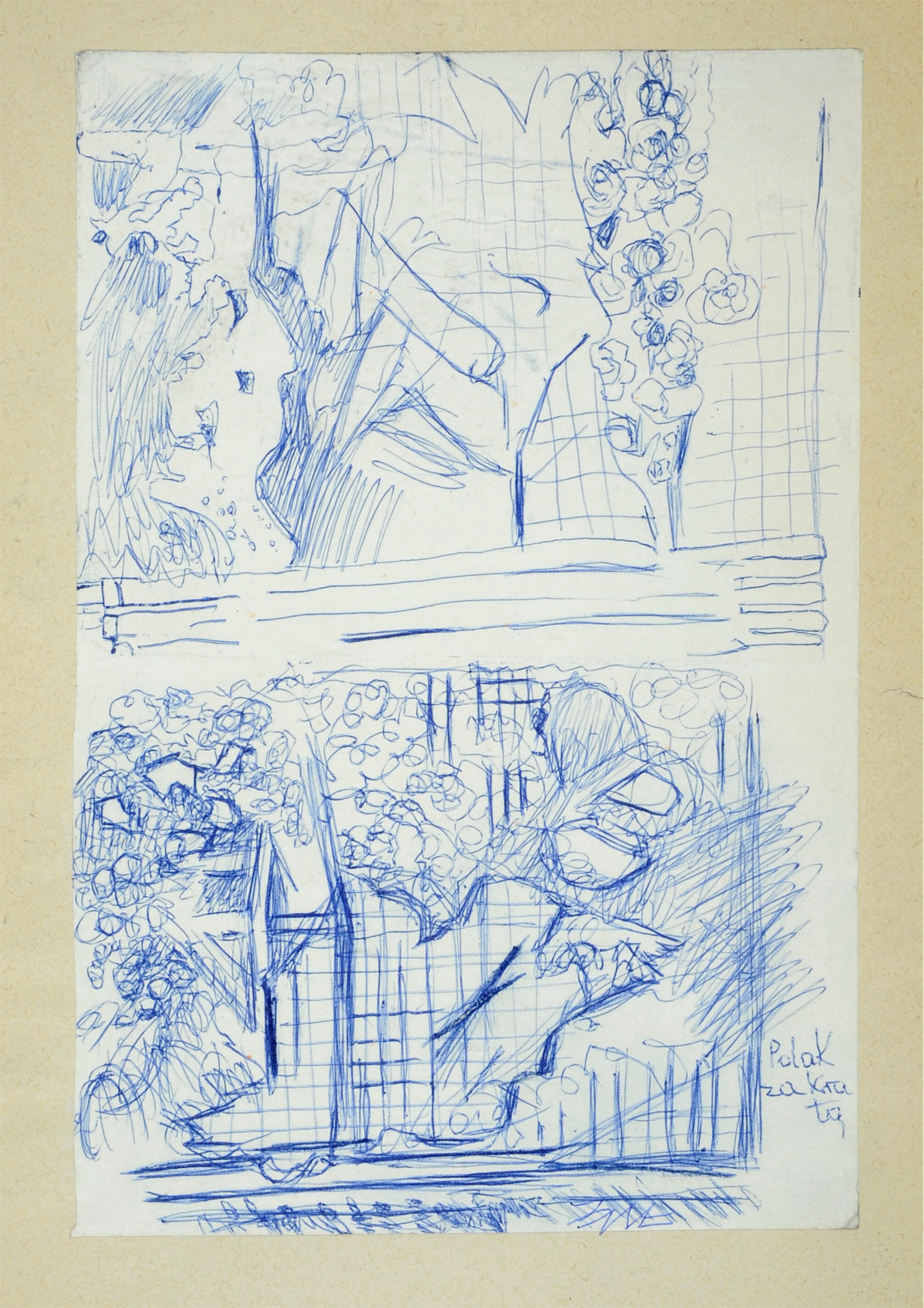niebieski długopis, papier naklejony na karton; 21,4 x 14,2 cm (wymiar arkusza papieru), 29,4 x 21 cm (wymiar kartonu);