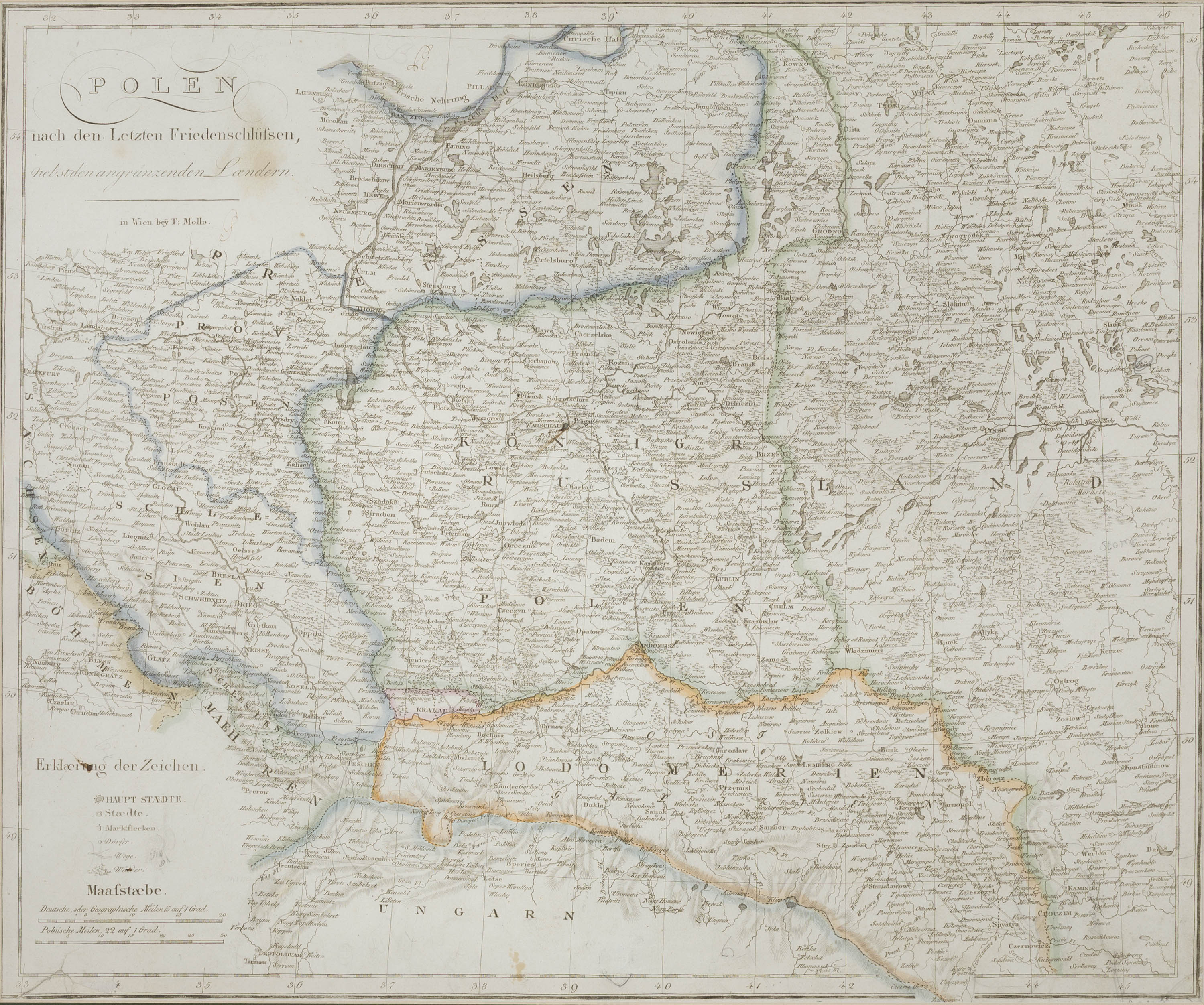 Mapa ziem Rzeczpospolitej, Wiedeń 1800 miedzioryt kolorowany liniowo, 38 x 46 cm (w świetle oprawy) stan zachowania dobry, zaplamienie, reperowane rozdarcie w lewym dolnym narożniku, lekkie przetarcia papieru w dolnej partii