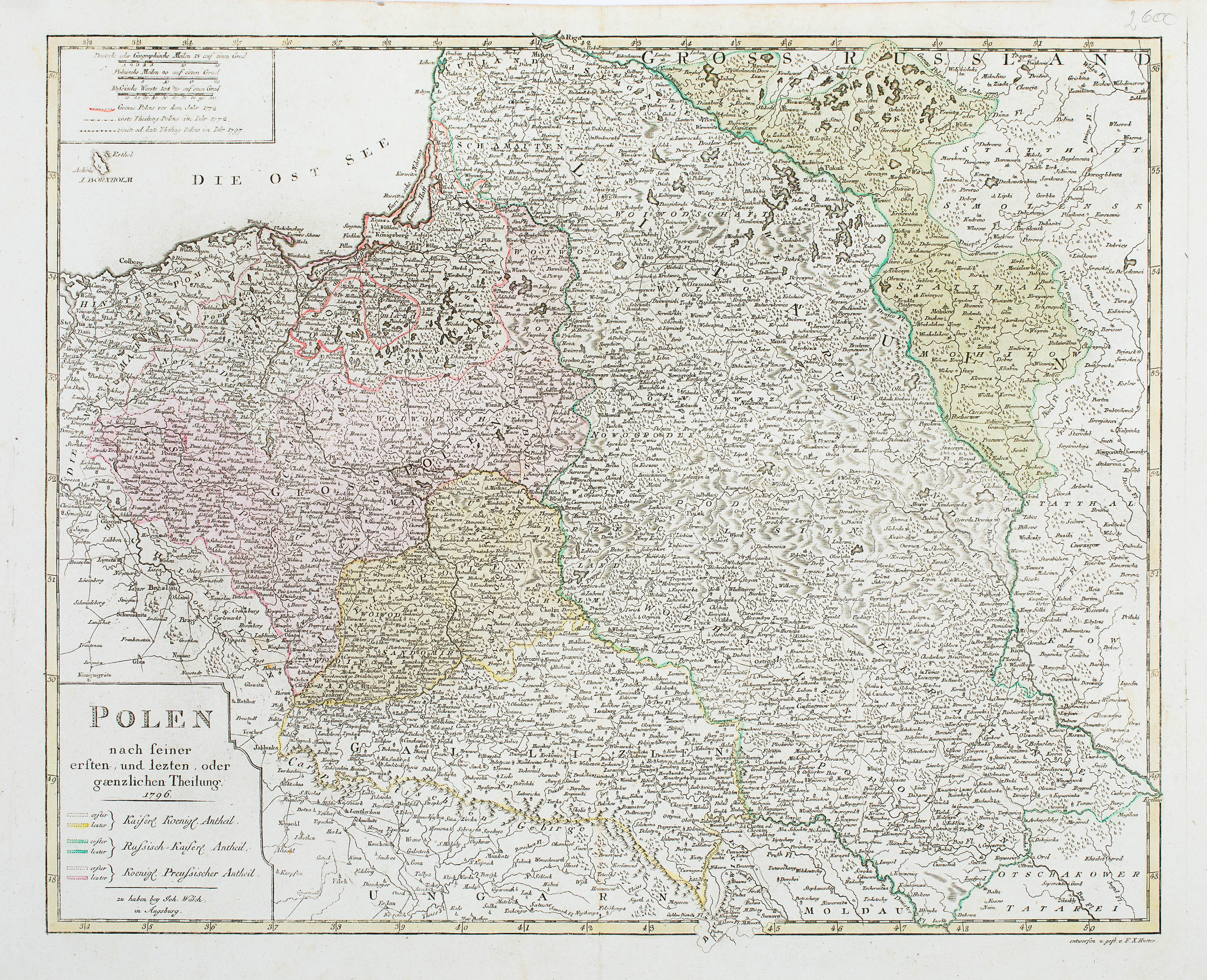 Mapa ziem Rzeczpospolitej, stan trzeci, Augsburg, 1796miedzioryt kolorowany w epoce, wym. mapy 47 × 58,7 cmstan zachowania bardzo dobryImago Poloniae, K55/9