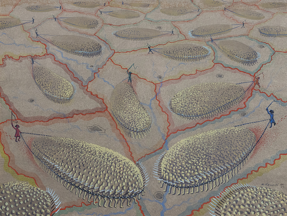 akwarela, gwasz/papier, 37,5 x 50 cm (w świetle passe-partout)sygnowany p.d.: M.Konarski VIII. 55opisany długopisem na odwrocie: Marian Konarski- " Polityka siły", 1955 r.