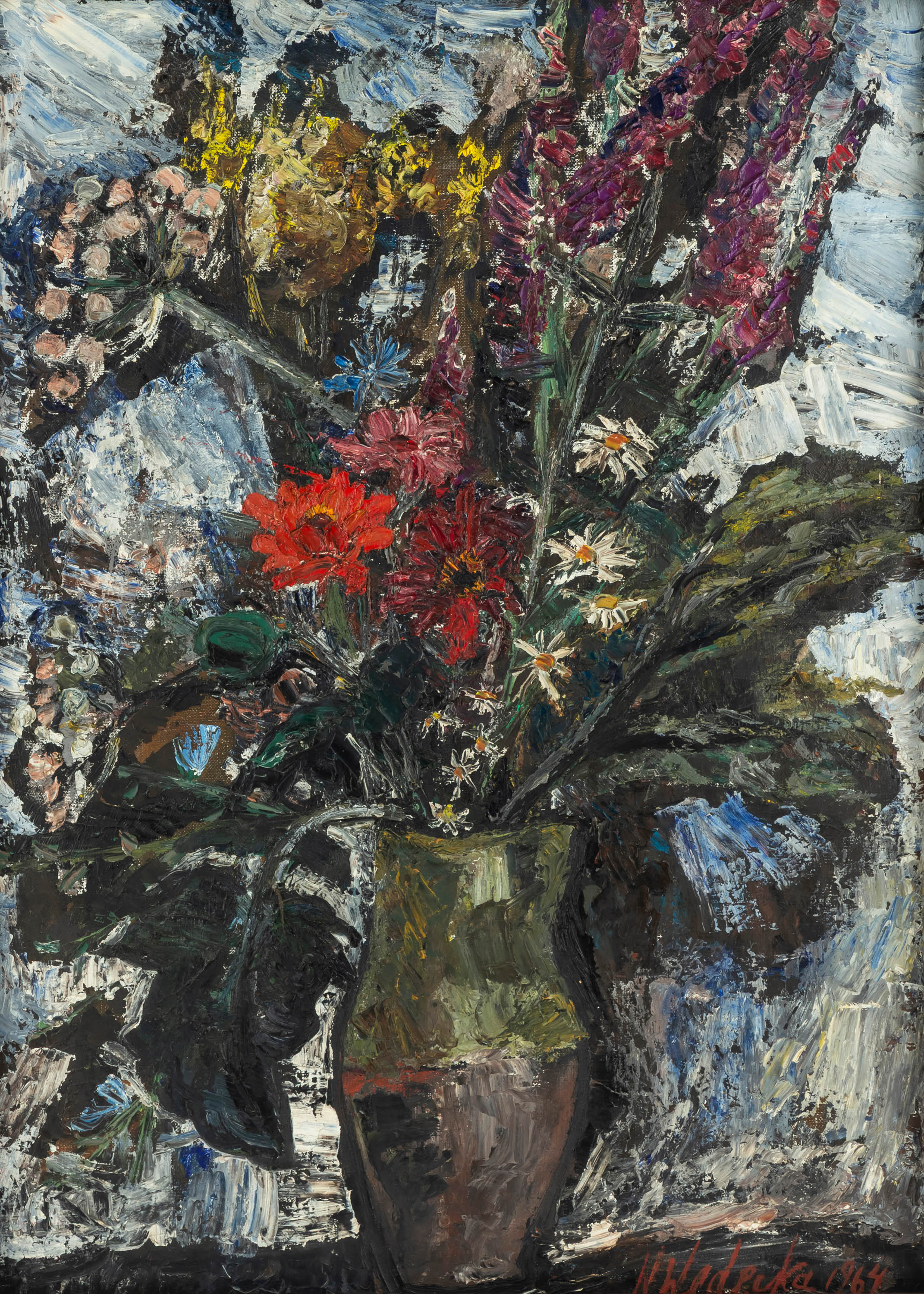olej, płótno, 80 x 52 cm,sygn. i dat. p.d.: W.Wedecka '964,na odwrocie opisana, sygn. i dat.: W.Wedecka / Warszawa / 80 x 52 / "Polne kwiaty"